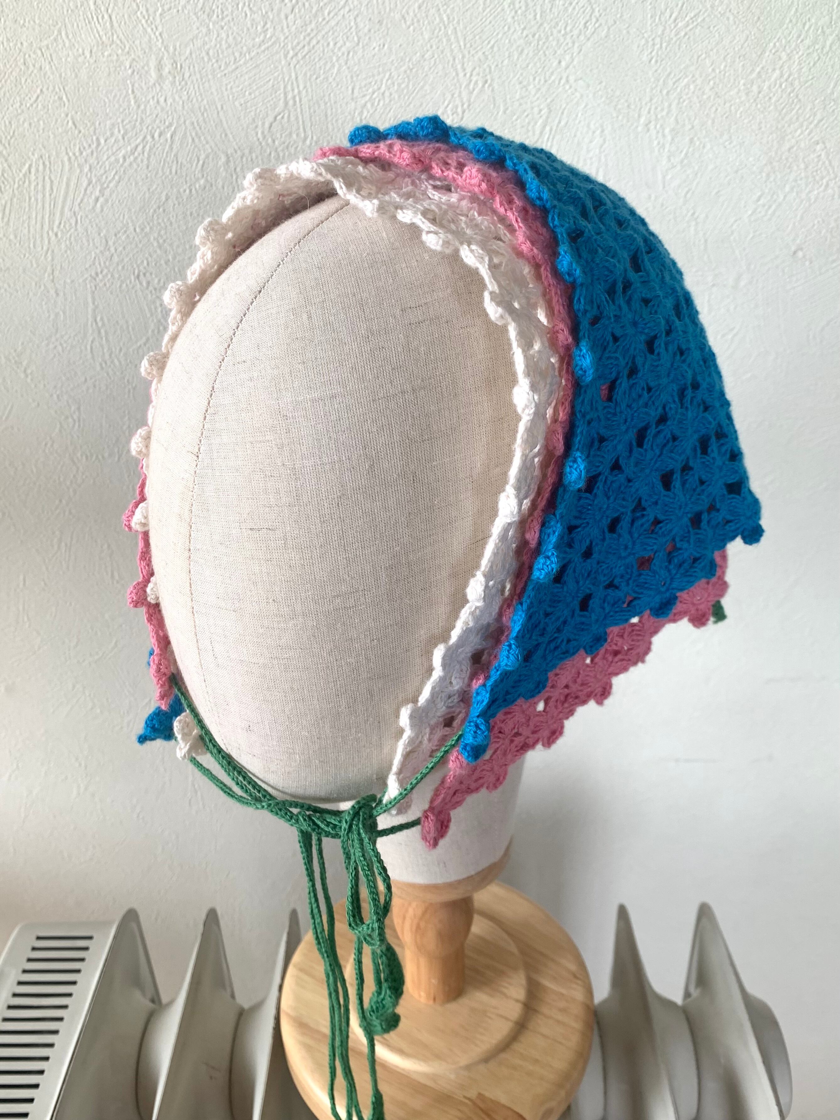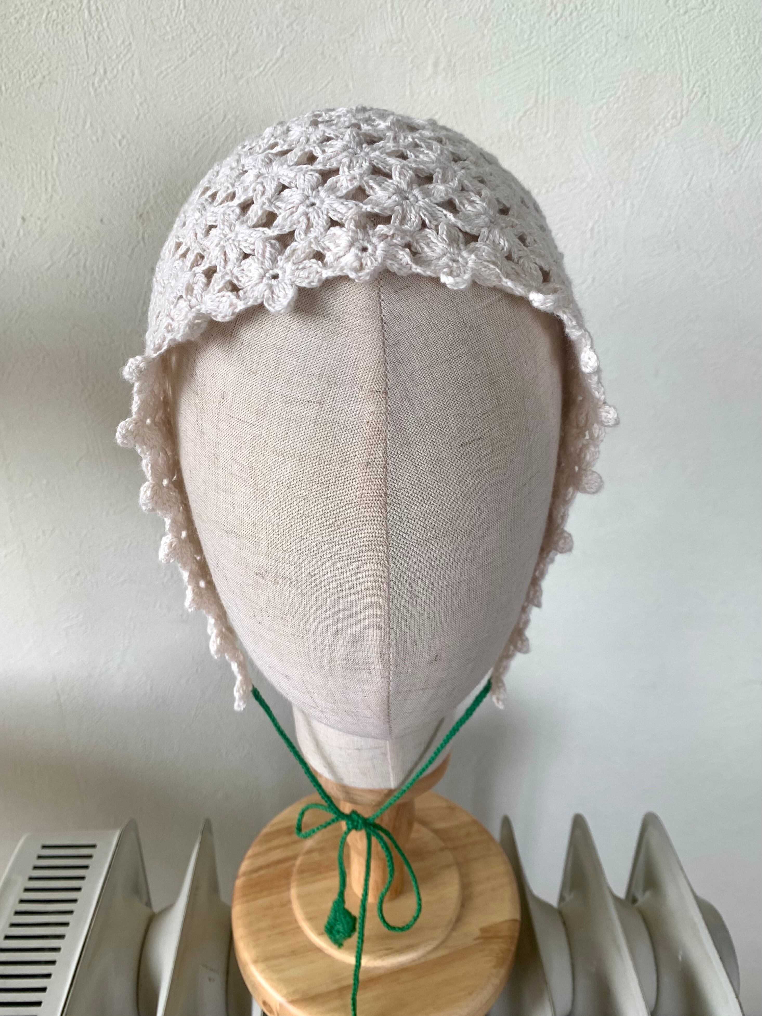 さらりとした肌触りの良い極細コットン糸で140花のモチーフを編んだバブーシュカ。