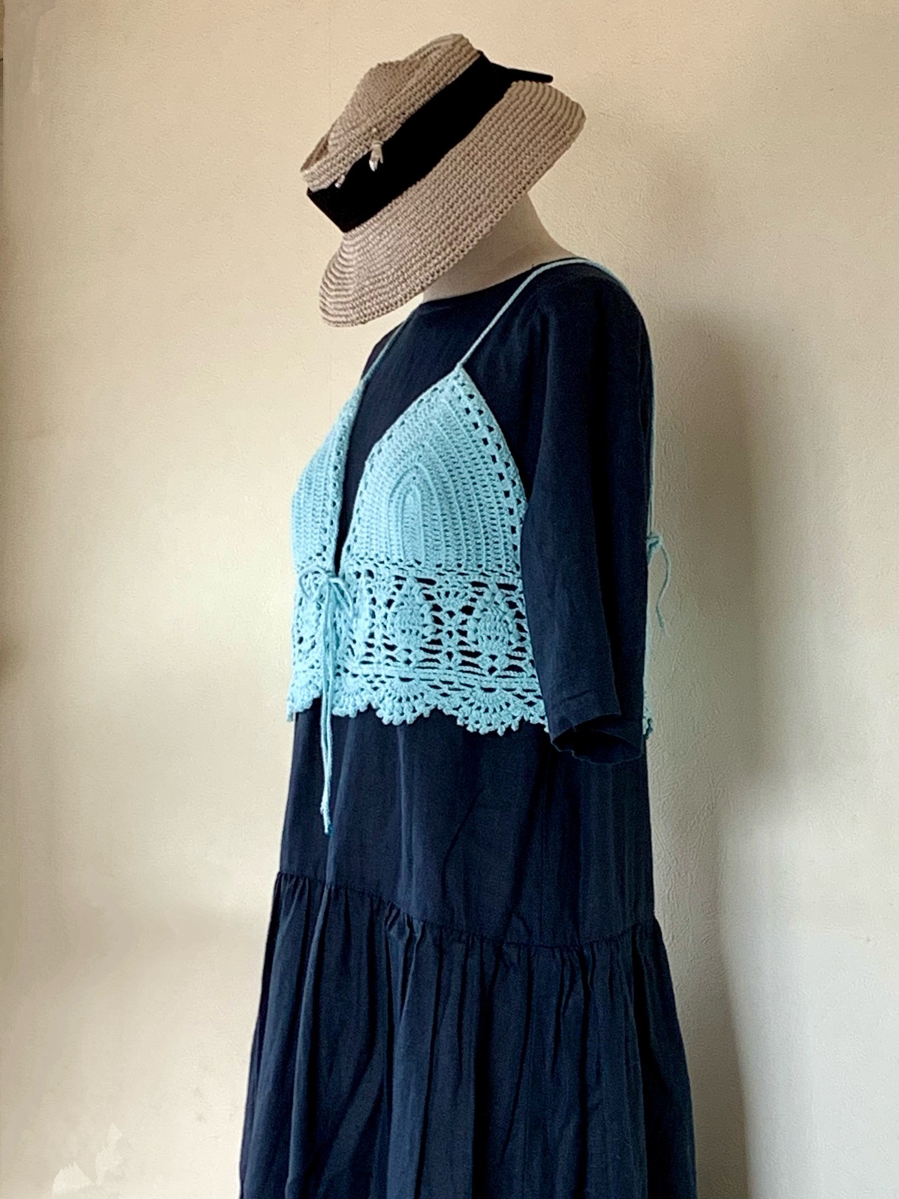 シンプルなブラ部分と、ロマンチックなパイナップル編みの模様でコントラストをつけました。