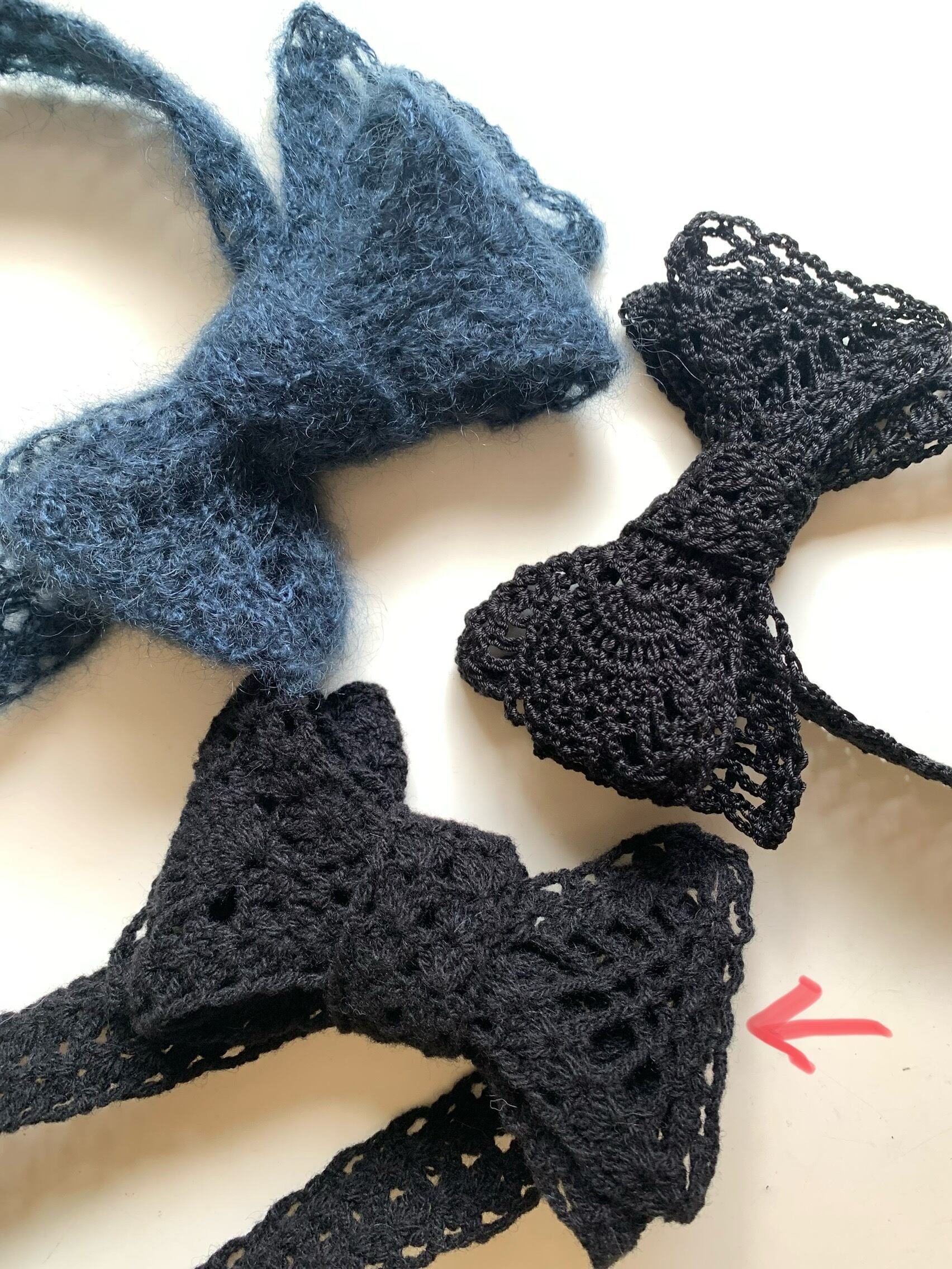 かぎ針編みのパイナップル模様でボウタイを編みました。こちらはウール100%の黒。