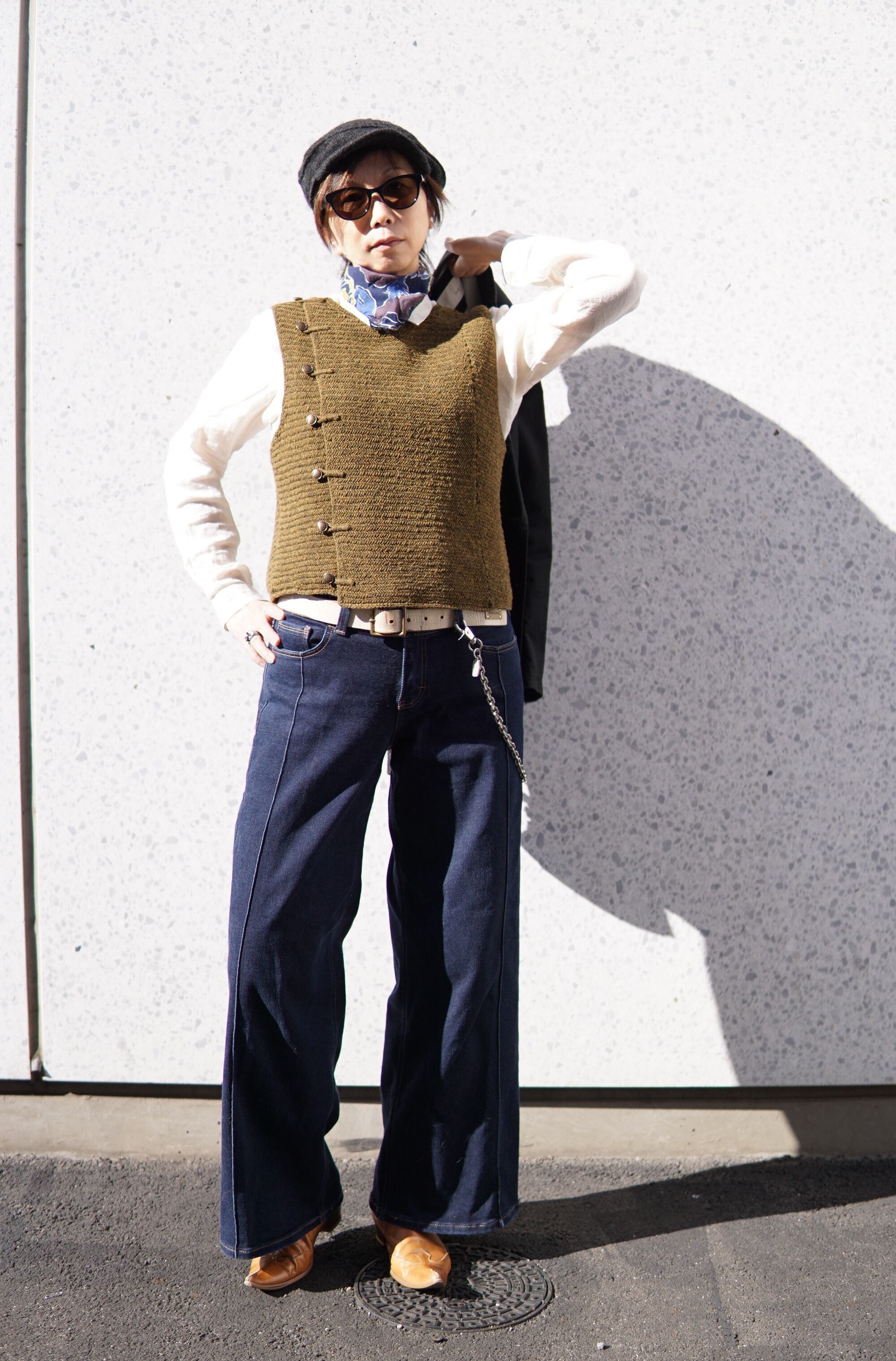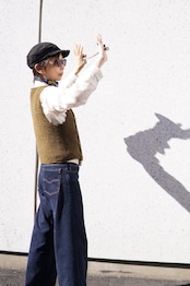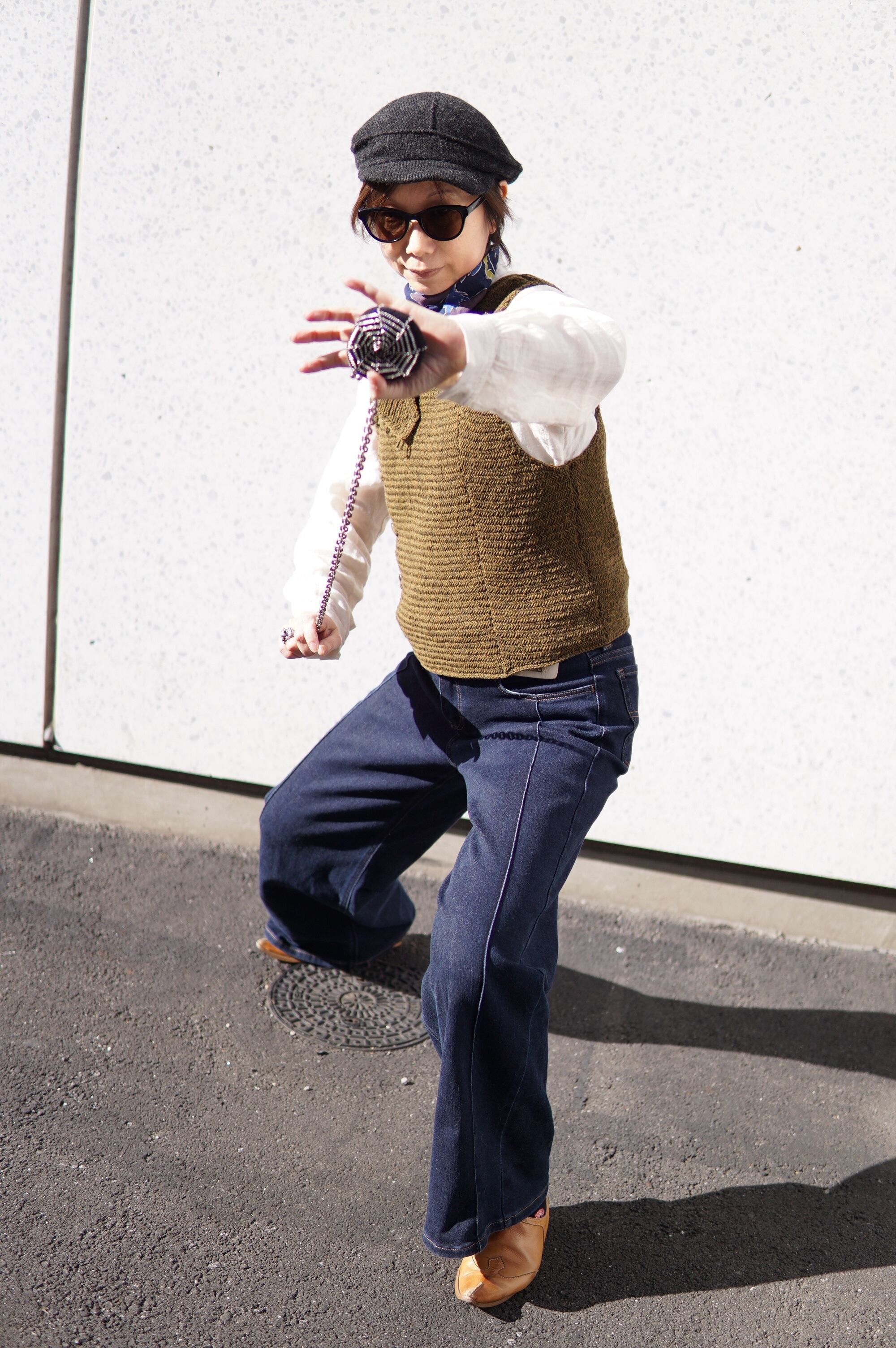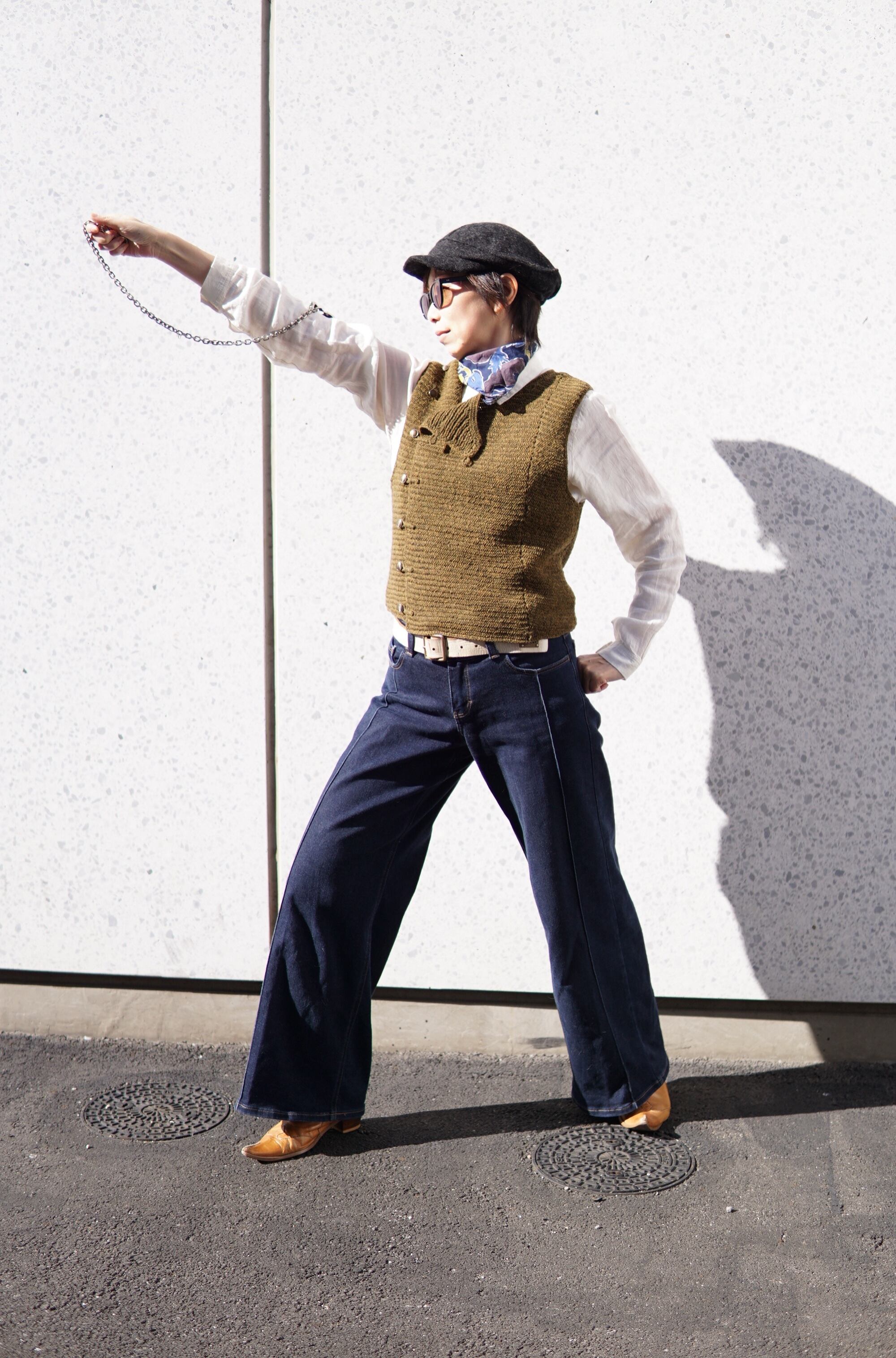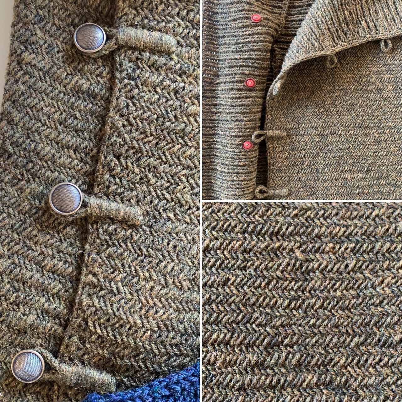 全面ヘリンボーン模様編みで仕立てた身頃をそれぞれ3枚に分割し計6枚のパーツを綴じ合わせることで、より身体に沿ったシルエットにしました。