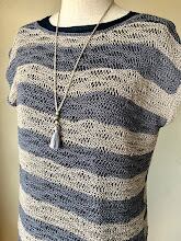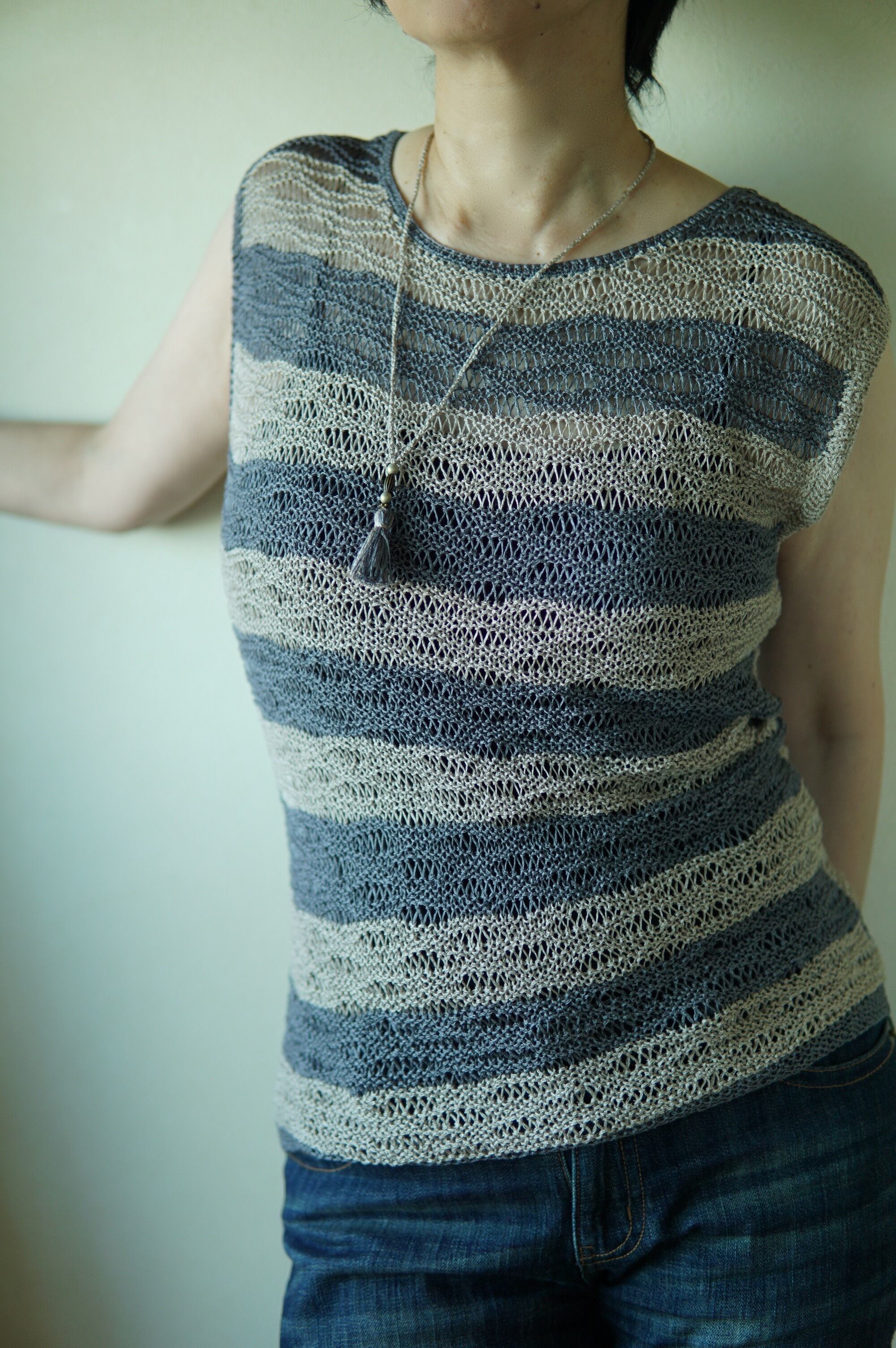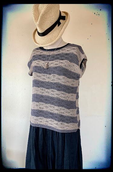 艶やかなリリヤーン状のシルク糸で、ベージュとチャコールグレーのボーダーニットを編みました。