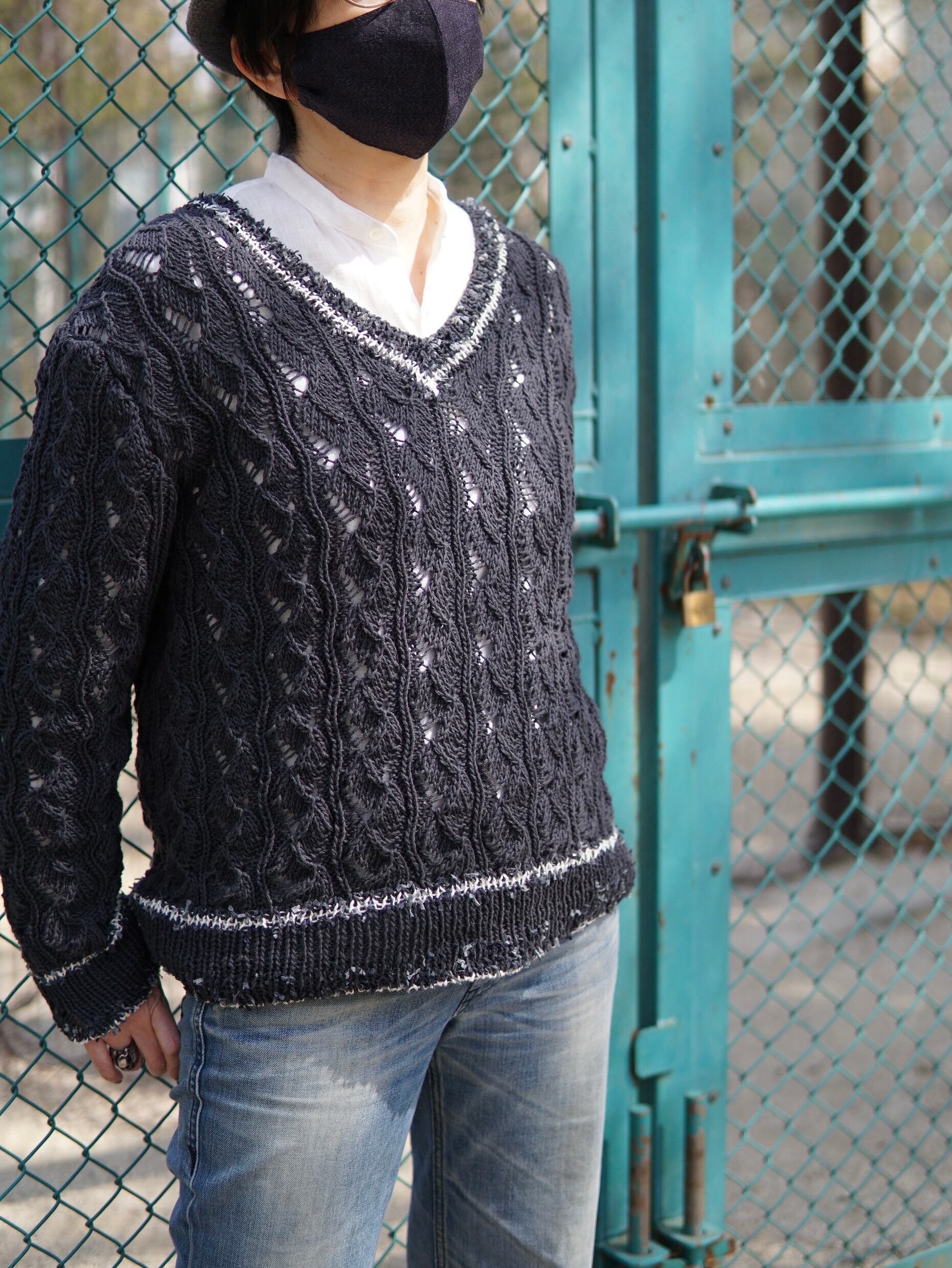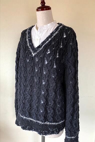 リネンとコットンのさらりとした糸でちょっとワルなイメージで編みました。