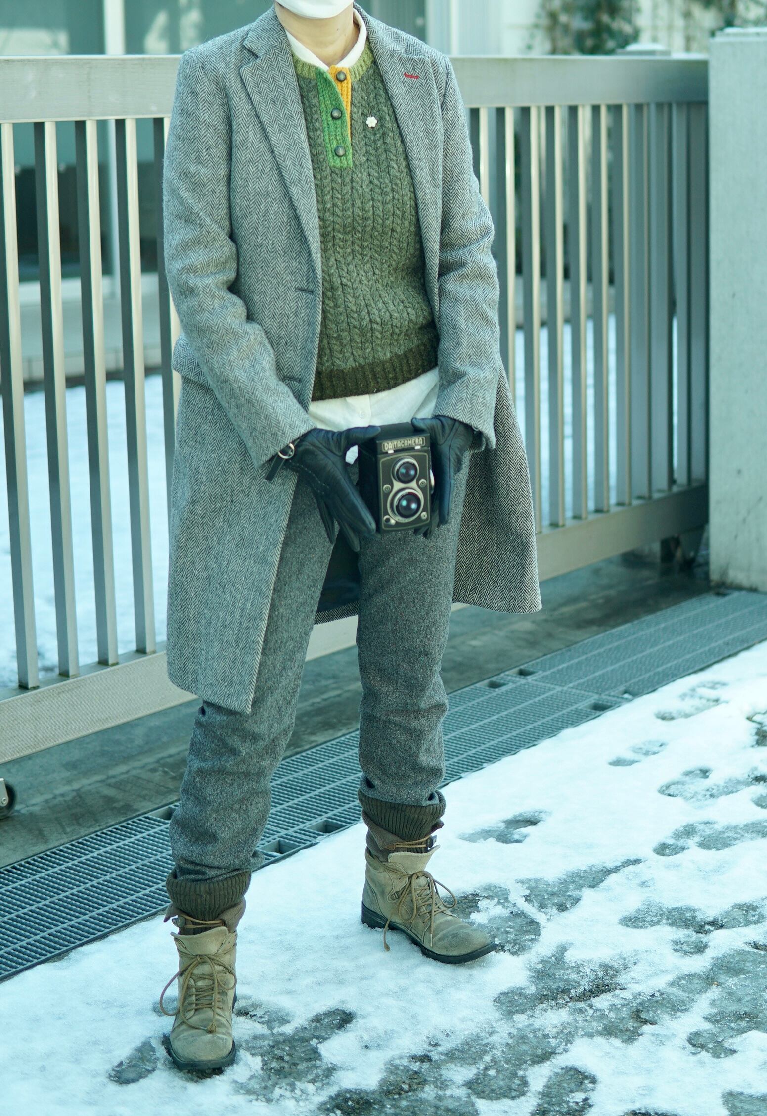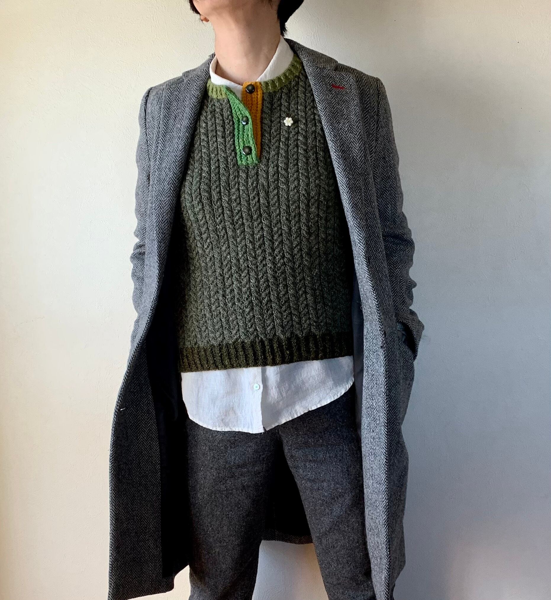 本体、襟、前立、袖口、裾、すべての箇所を交差編みしています。