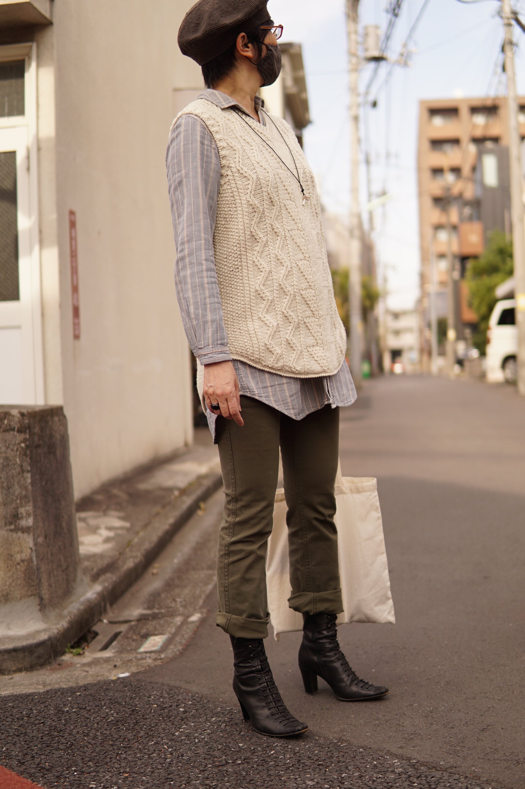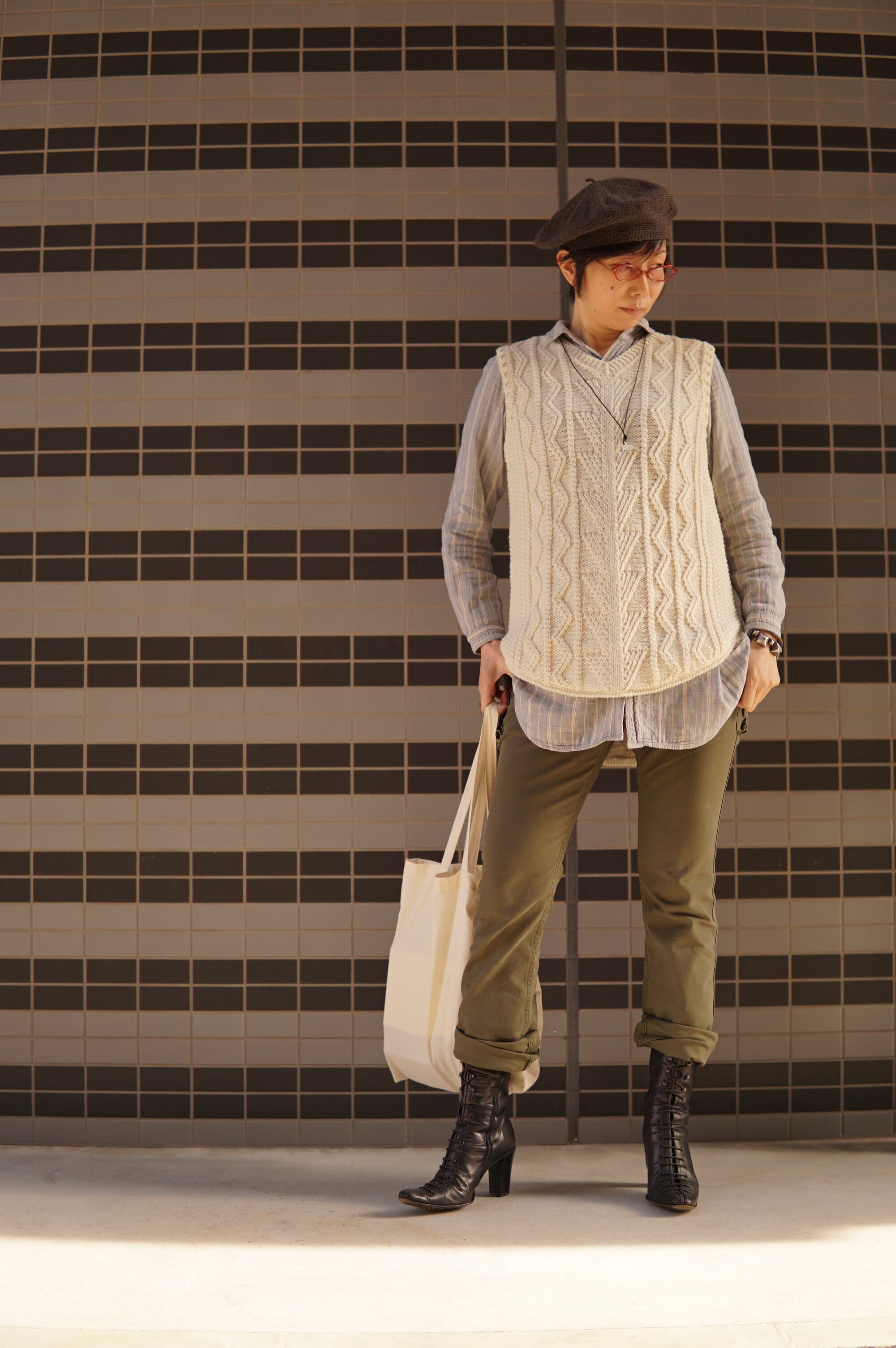 使用糸はアラン模様がキッチリと浮かぶチェビオットウール。しっかりとしたコシがあり、摩擦に強い上に軽くて暖かい糸です。
