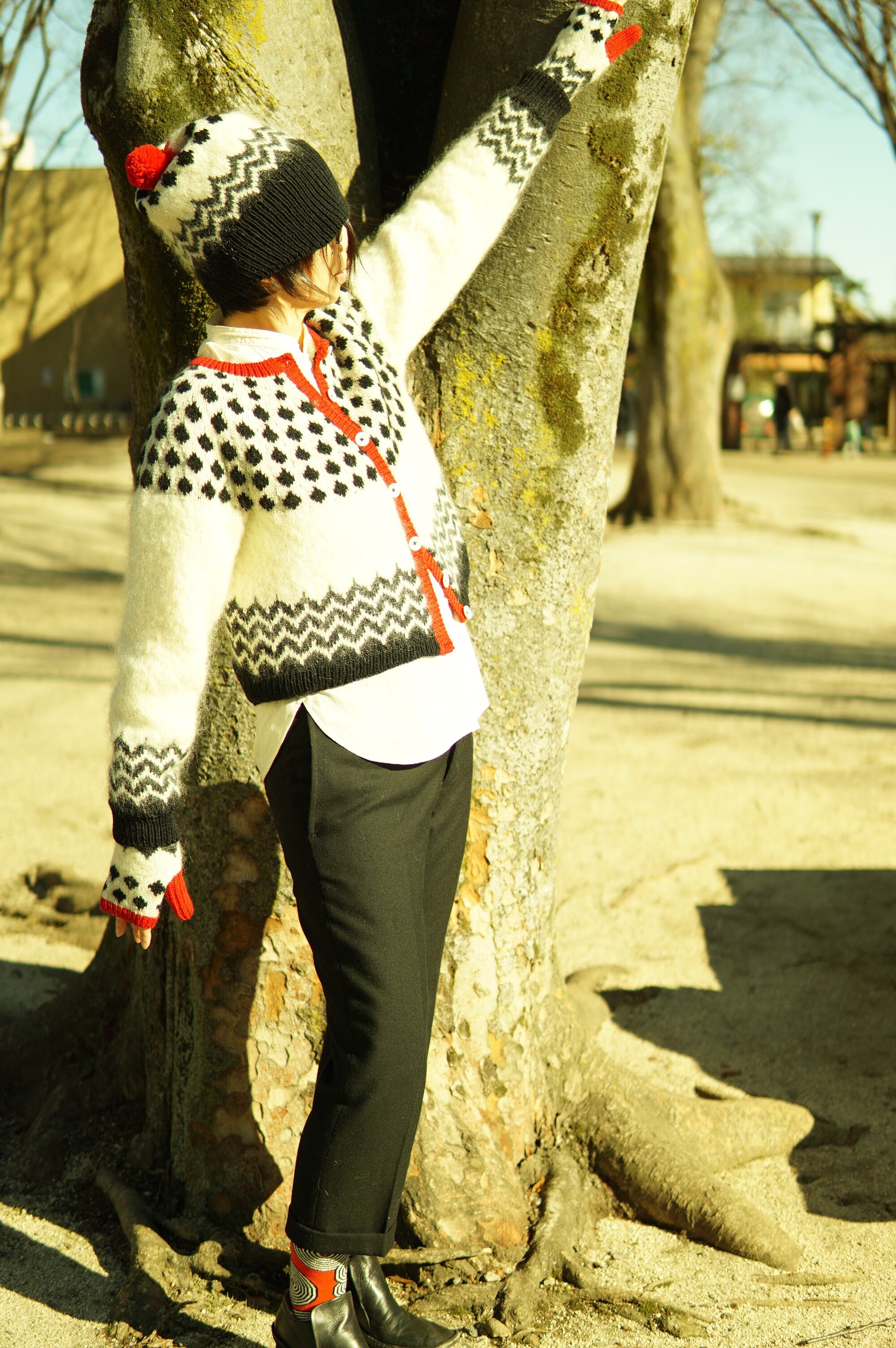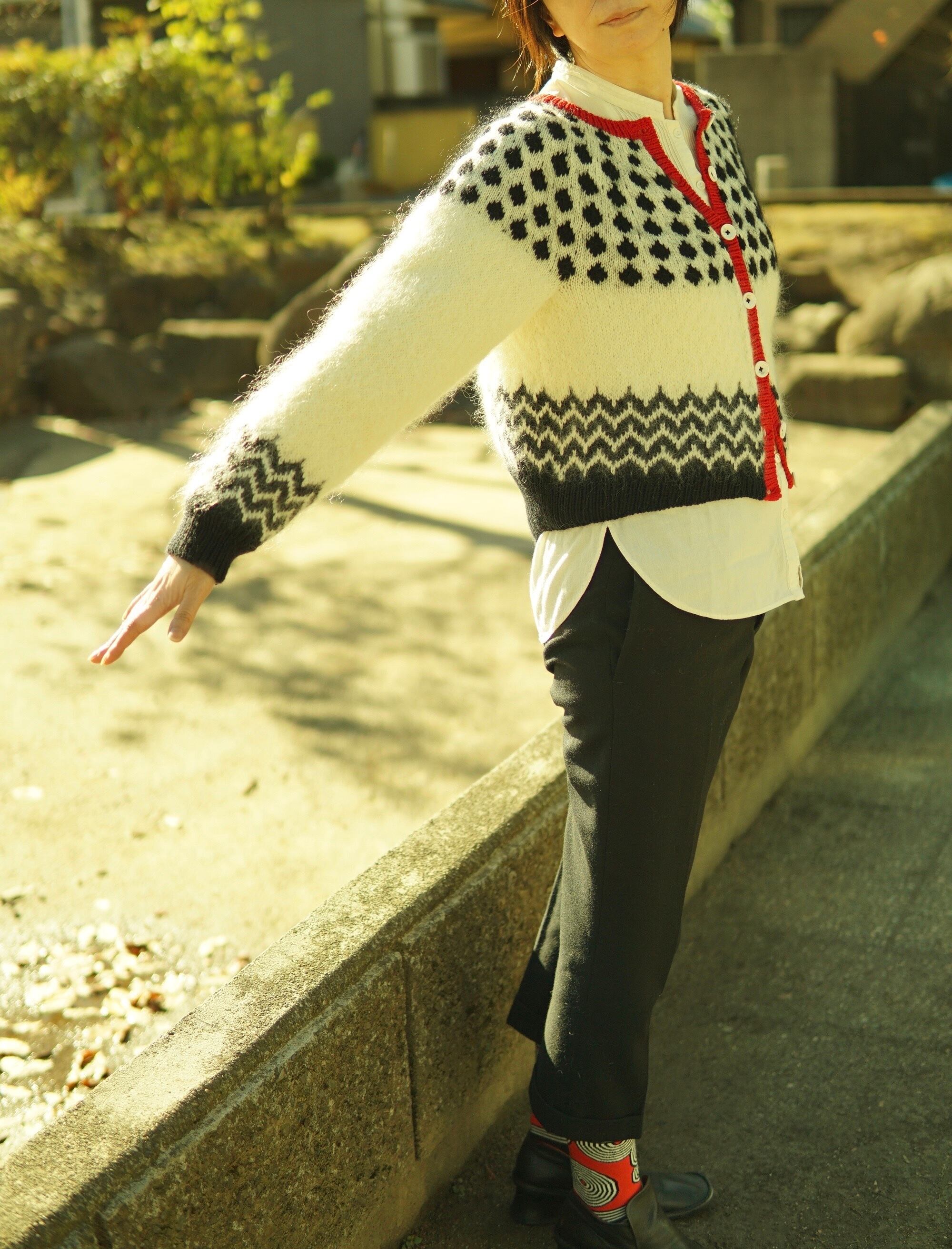そんなアカゲラの模様をイメージしてカーディガンを編んでみました。