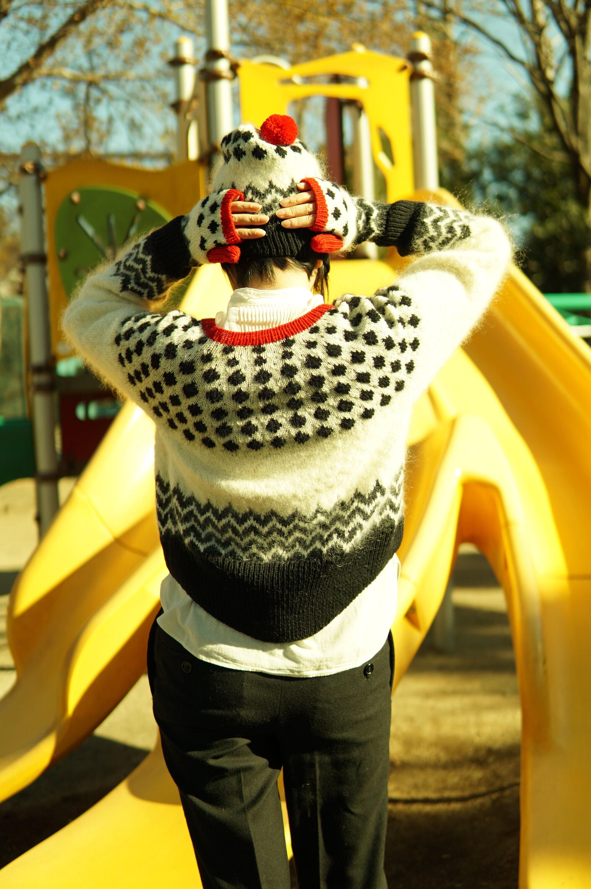 白い部分も2種類の糸を使用してジグザグ模様を編み、しっかりとあたたかくニュアンスのある編み地に仕上げました。