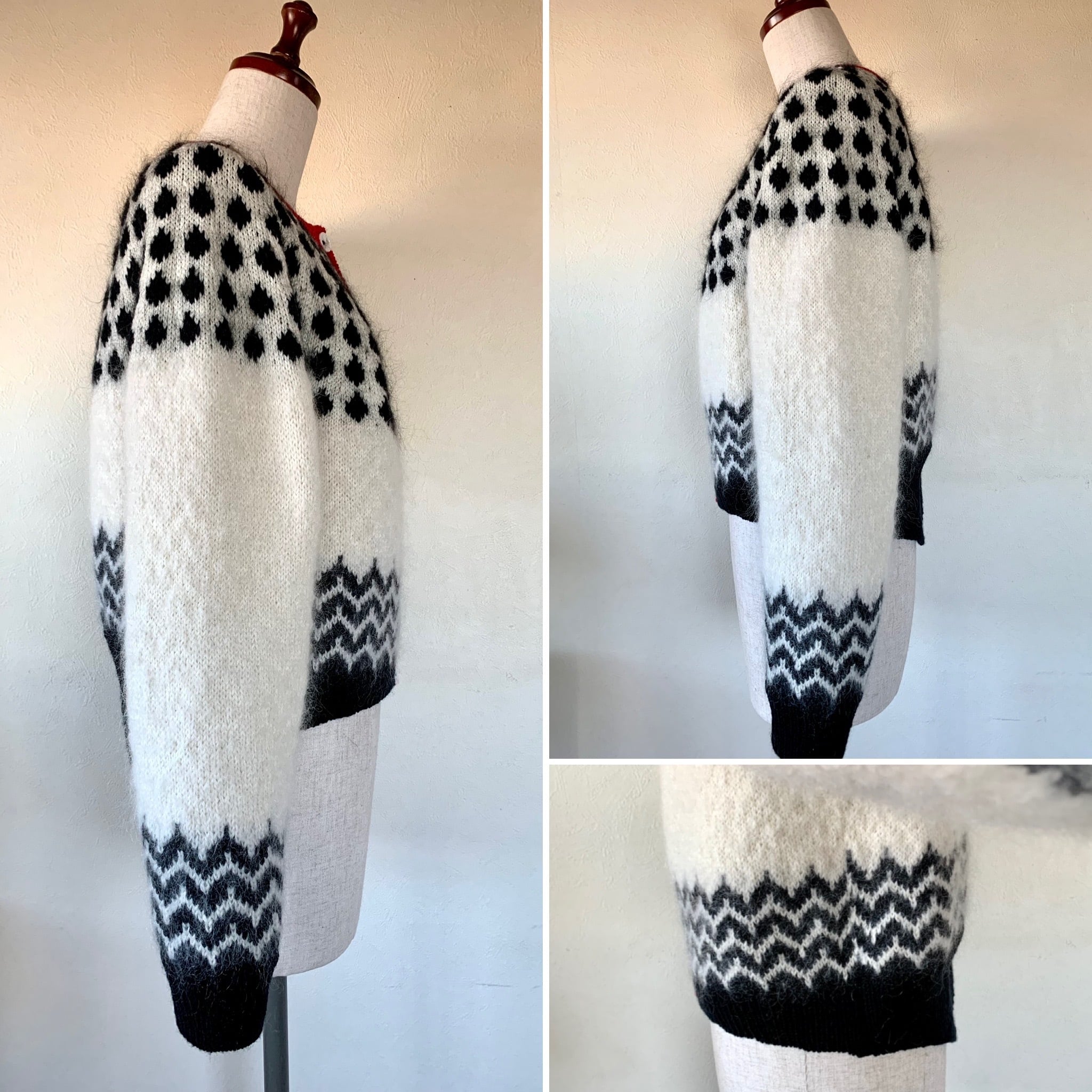 ふんわりと柔らかいウールの毛糸とチクチク皆無のウール100%のモヘヤ糸を編み込み、ころんと丸いシルエットの軽くあたたかなカーディガンです。