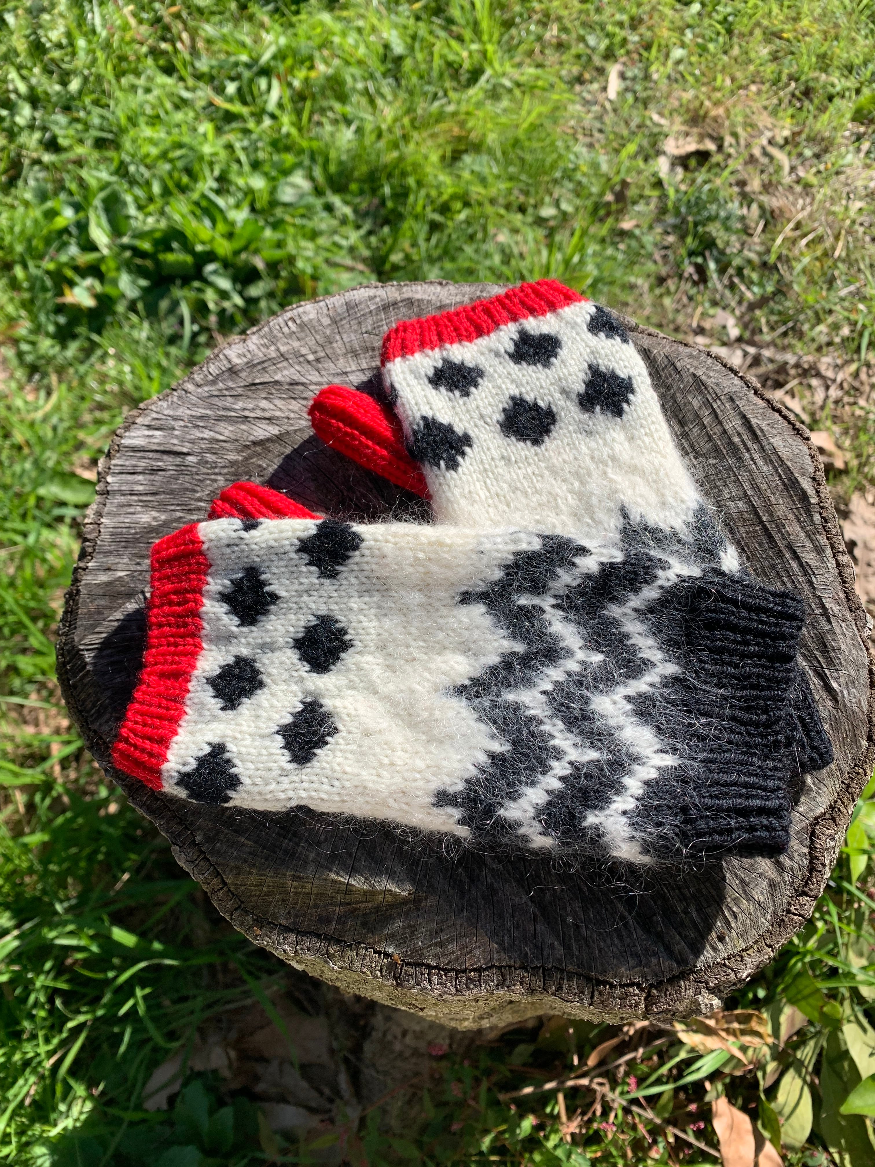 そんなアカゲラの模様をハンドウォーマーに編んでみました。