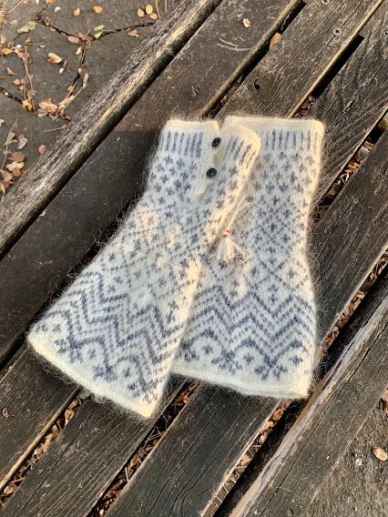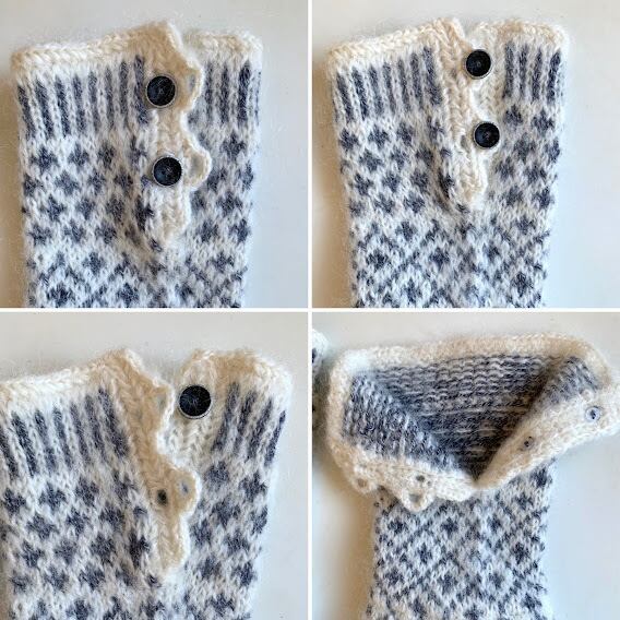 肘側はボタン2つで留める仕様で、編み地の中のボタンホールと外側ループの2箇所ずつで留められるので、ご着用の服などに応じて調整が可能です。