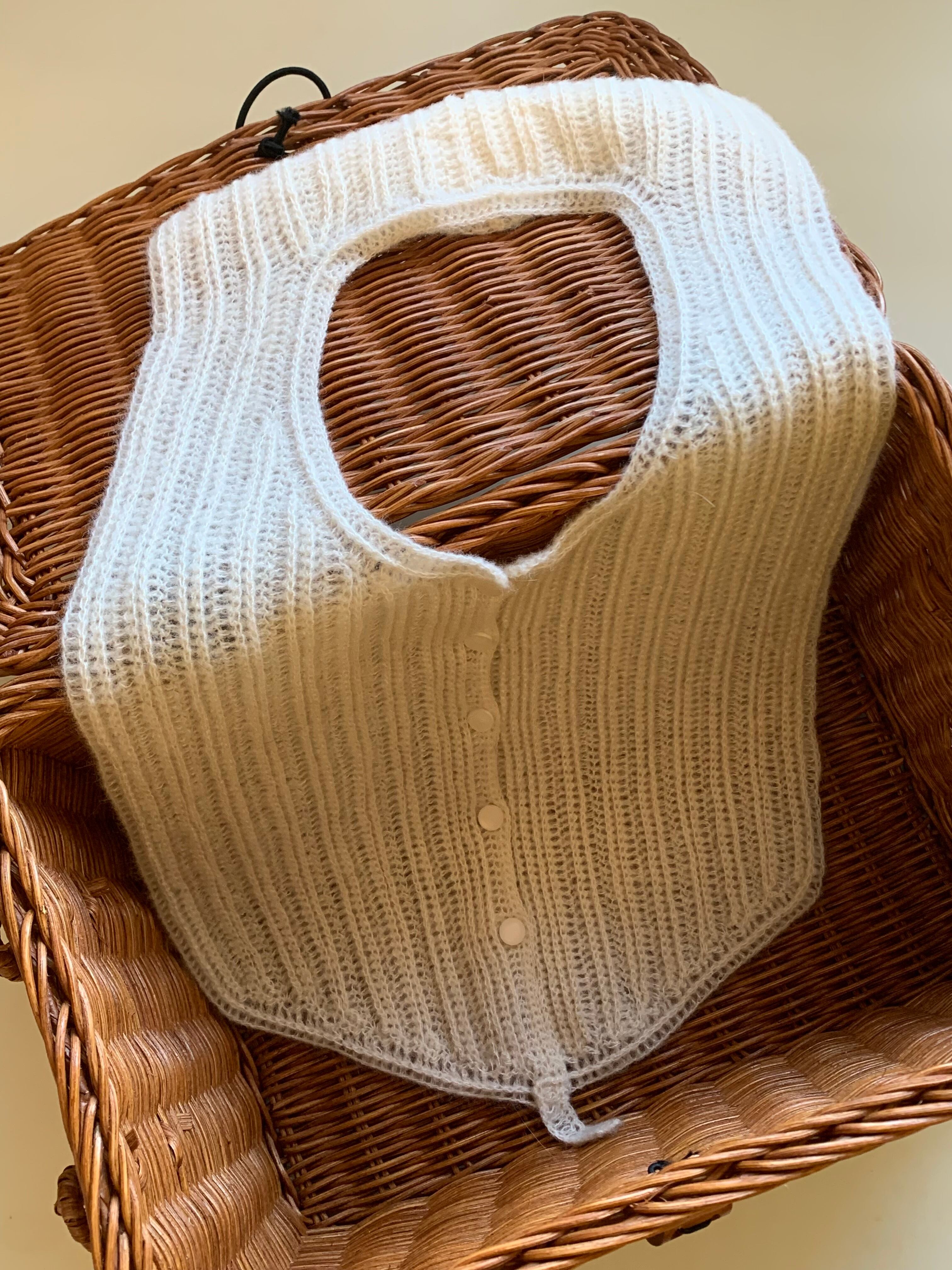 細く繊細なホワイトのシルク糸のまわりにふわっとウールが毛吹いた糸で編んだピンタックのようなヨーク付け襟です。