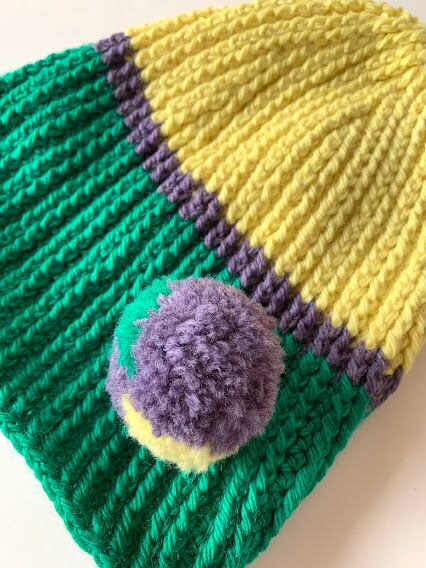 黄色、緑、紫の三色の毛糸で編んだニット帽です。きっちり地厚な編み地なので耳がちぎれそうに寒い時もあったかです。折ってかぶったり、伸ばしてかぶったり、お好きなシルエットを探してみてください。さらに、てっぺんの大きなポンポンは安全ピンで取り外し可能にしました。コートなどにブローチとして付けてもかわいいです。