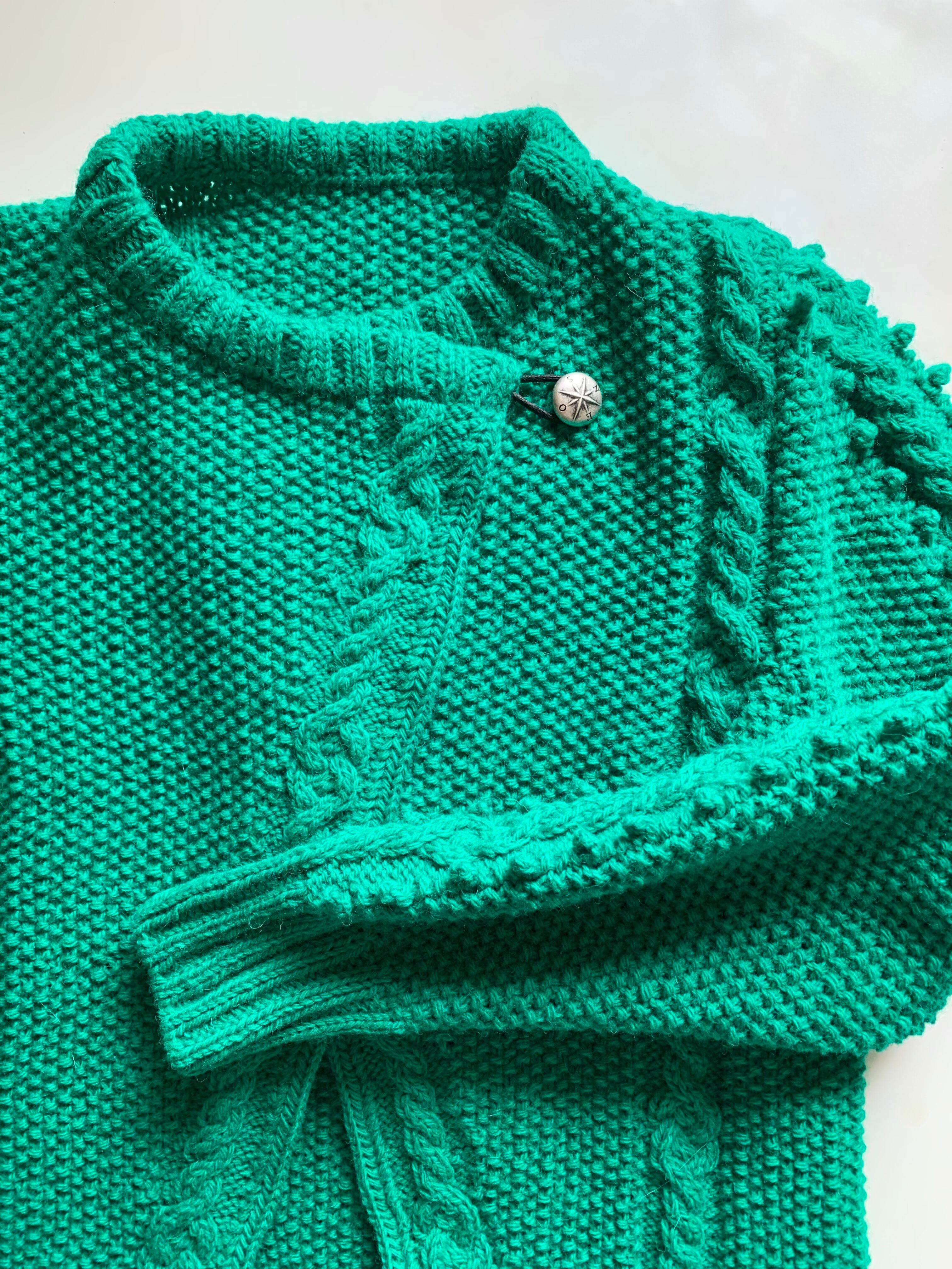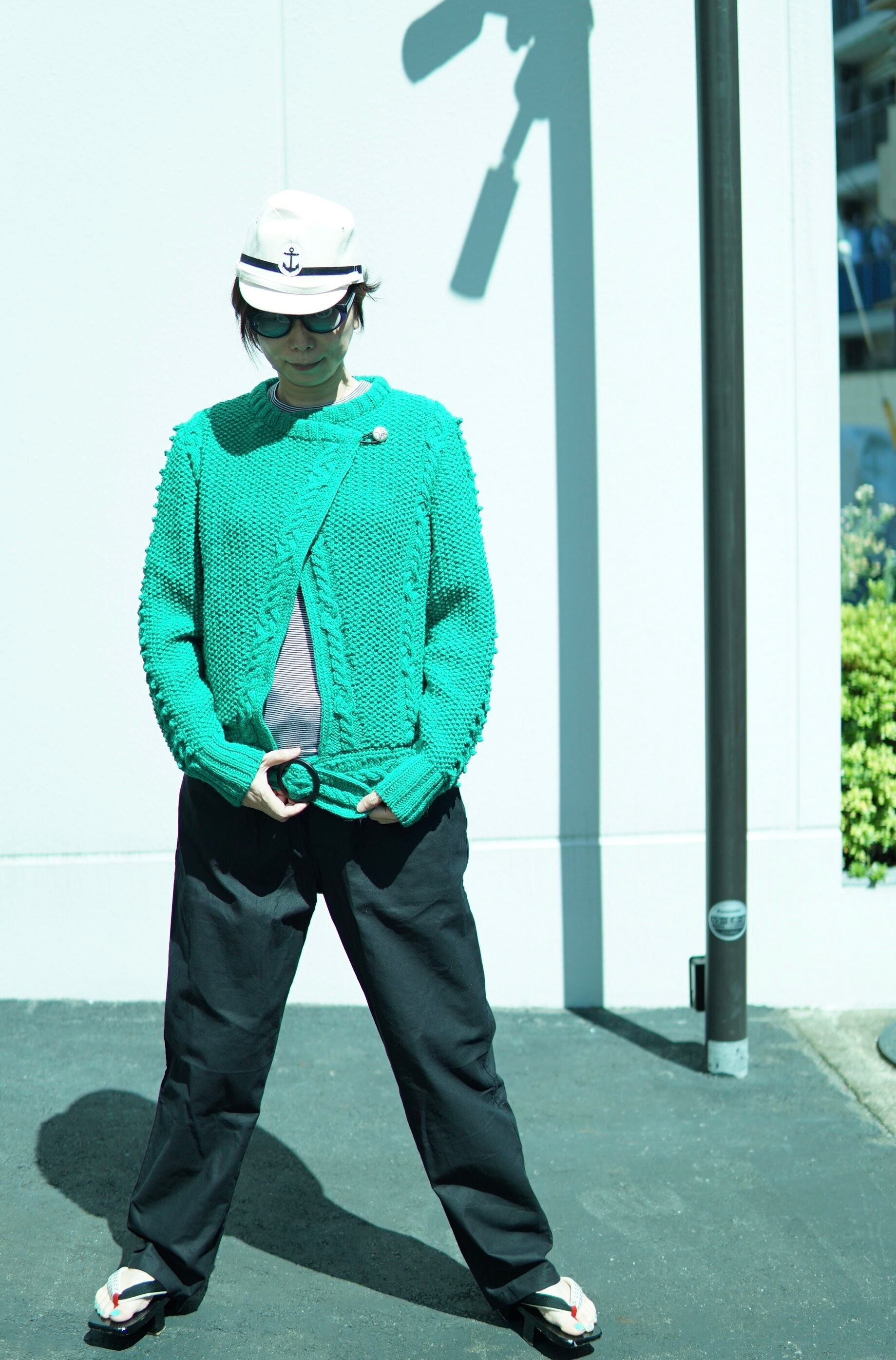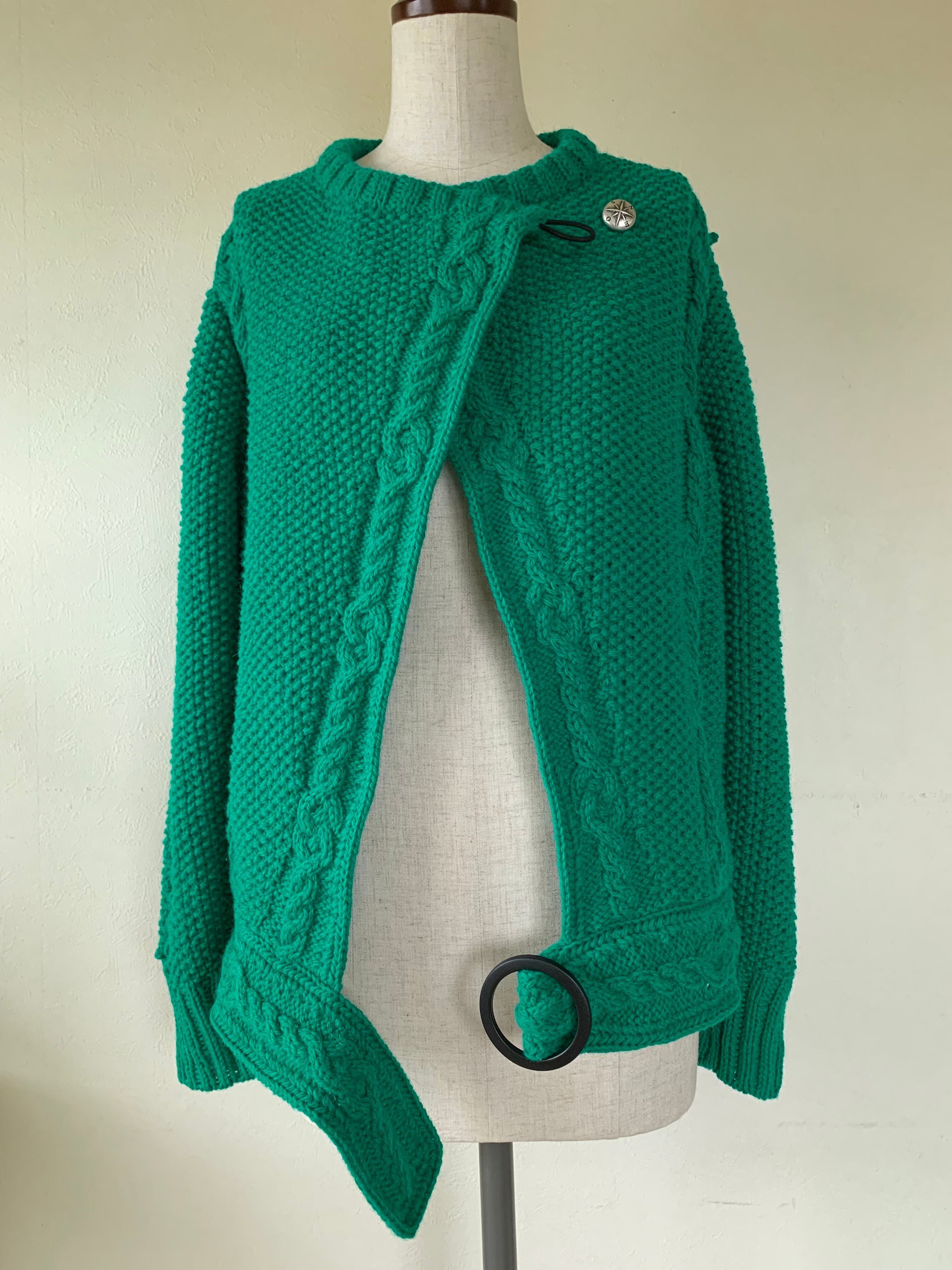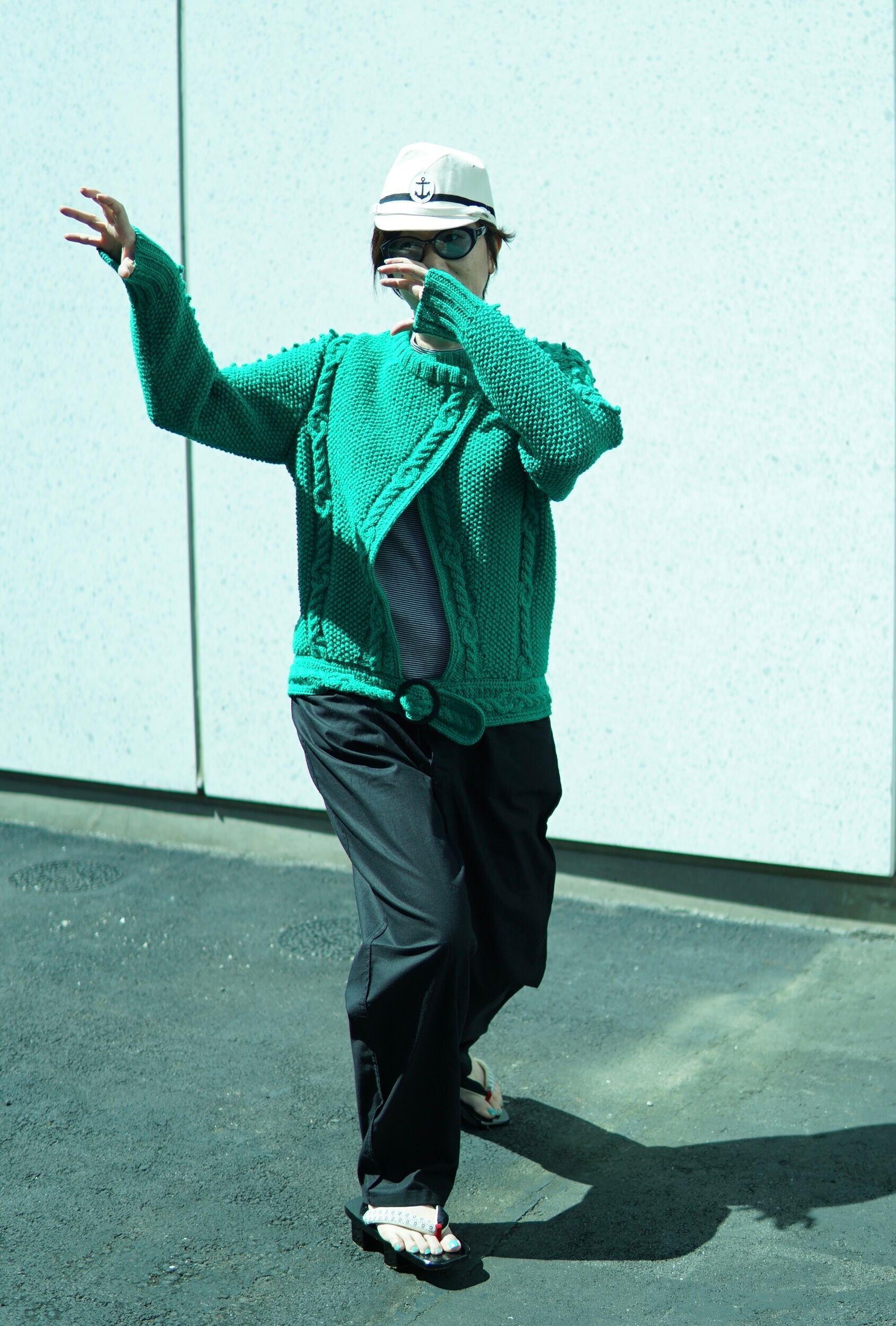秋から春にかけてさらりとひらりと着られるニットジャケットを製作しました。こちらはビビッドなエメラルドグリーンの緑ノッツ。