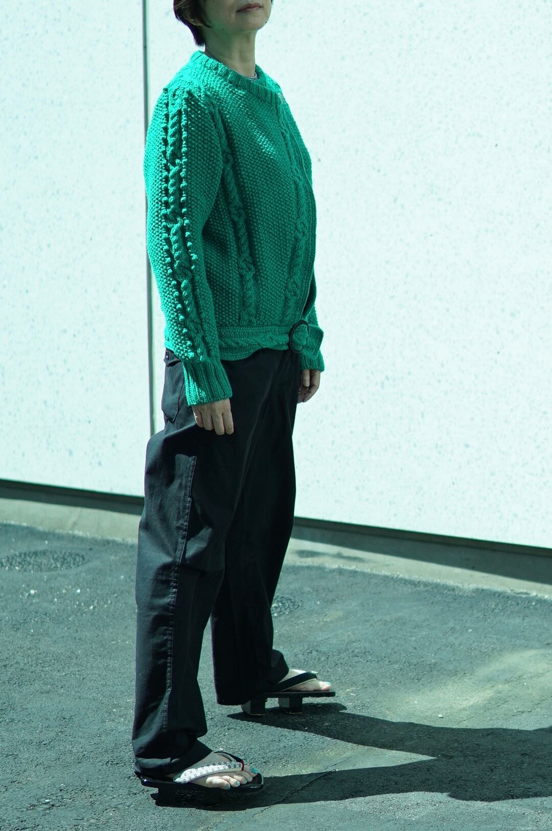 Knots模様にヘリンボーン編みで縁を付けたベルトには大きな丸いバックルをつけました。
