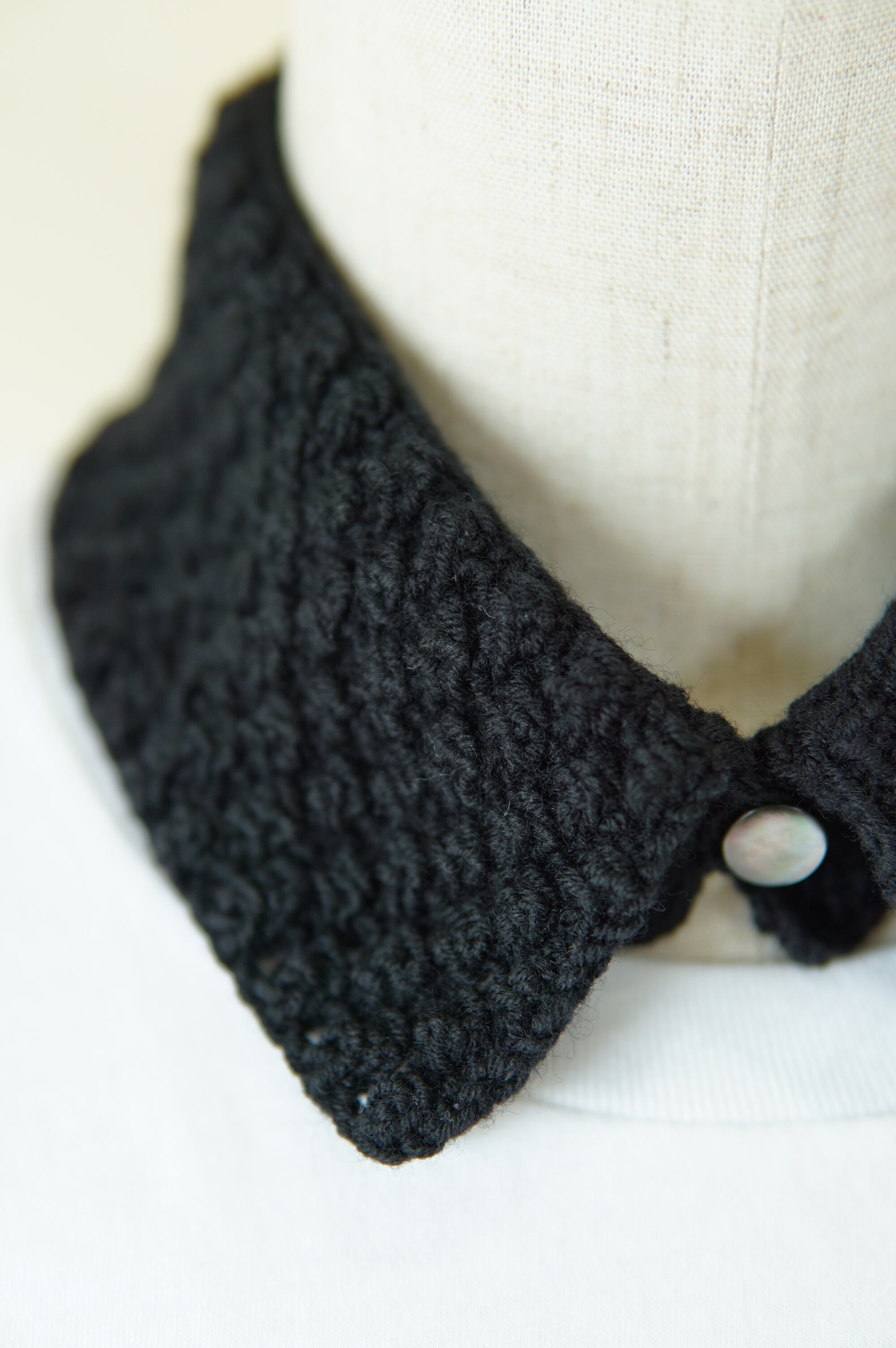 シンプルなシャツやワンピースやニットの首元を個性的に変化させるウール100%の付け襟。美しい貝ボタンひとつで留めてください。