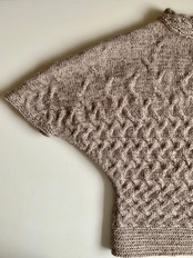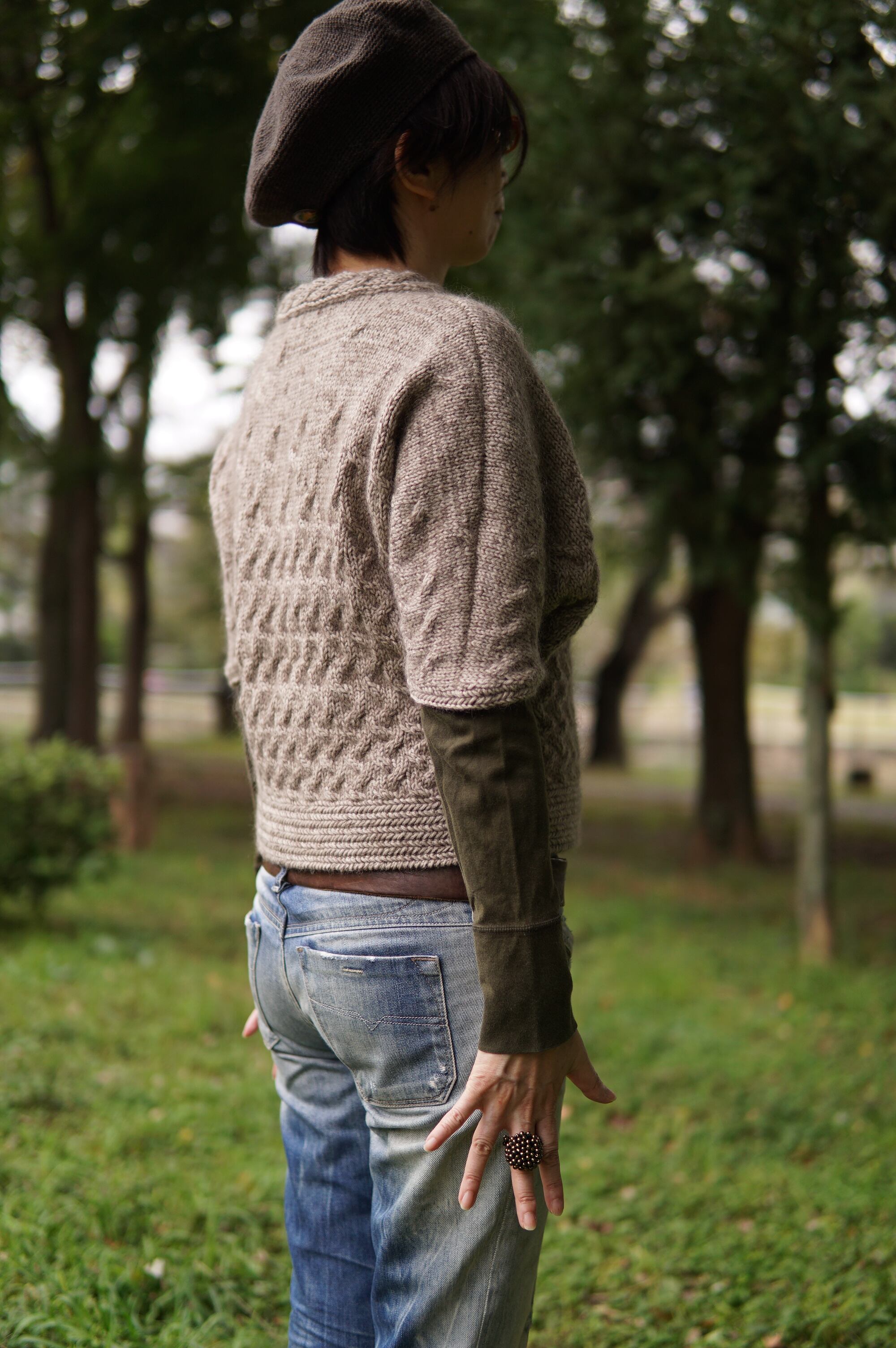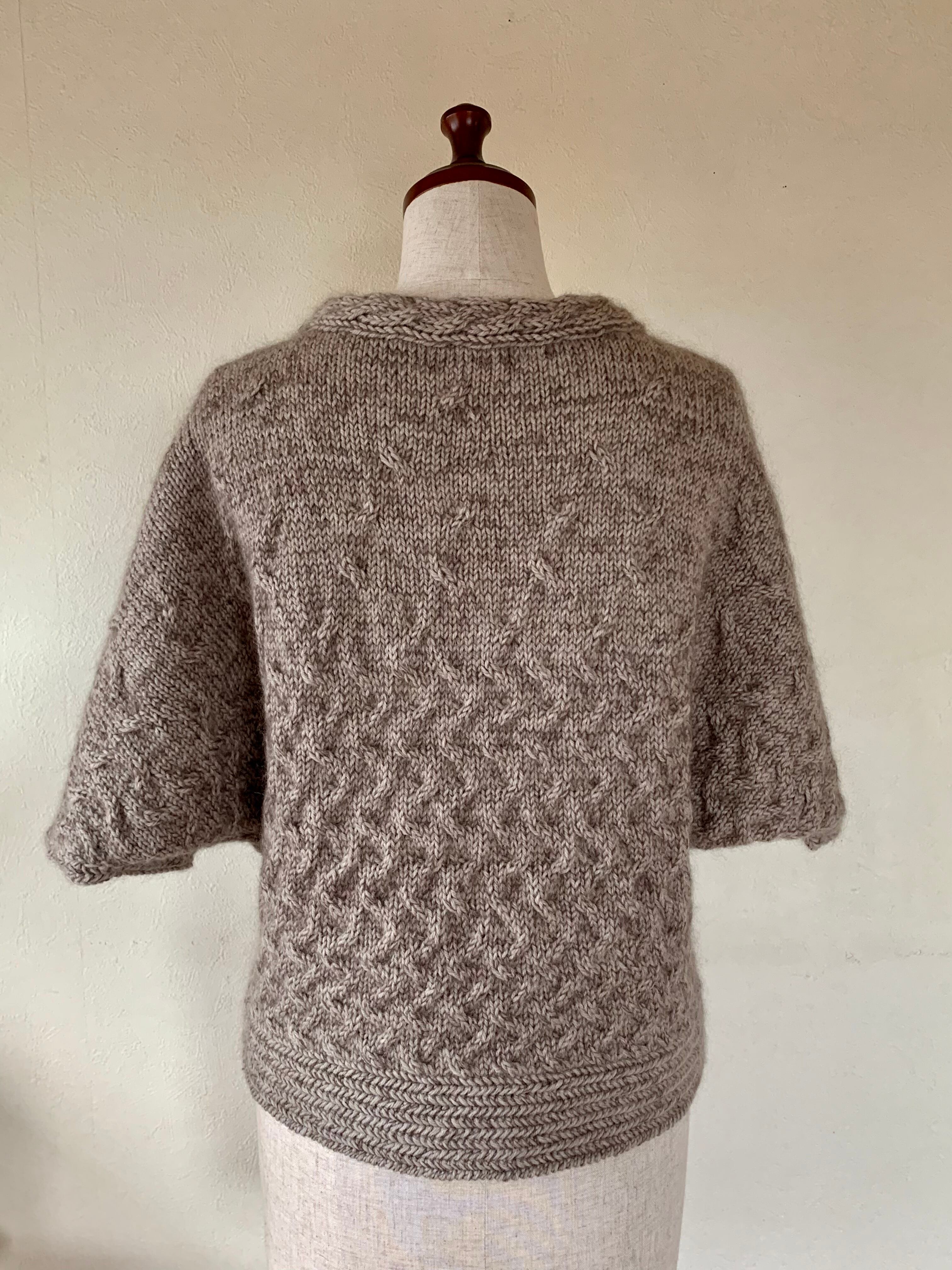 ニット全体を籠の形に見立てるためにドルマン袖に。重ね着しやすいように肘までの五分丈にしました。