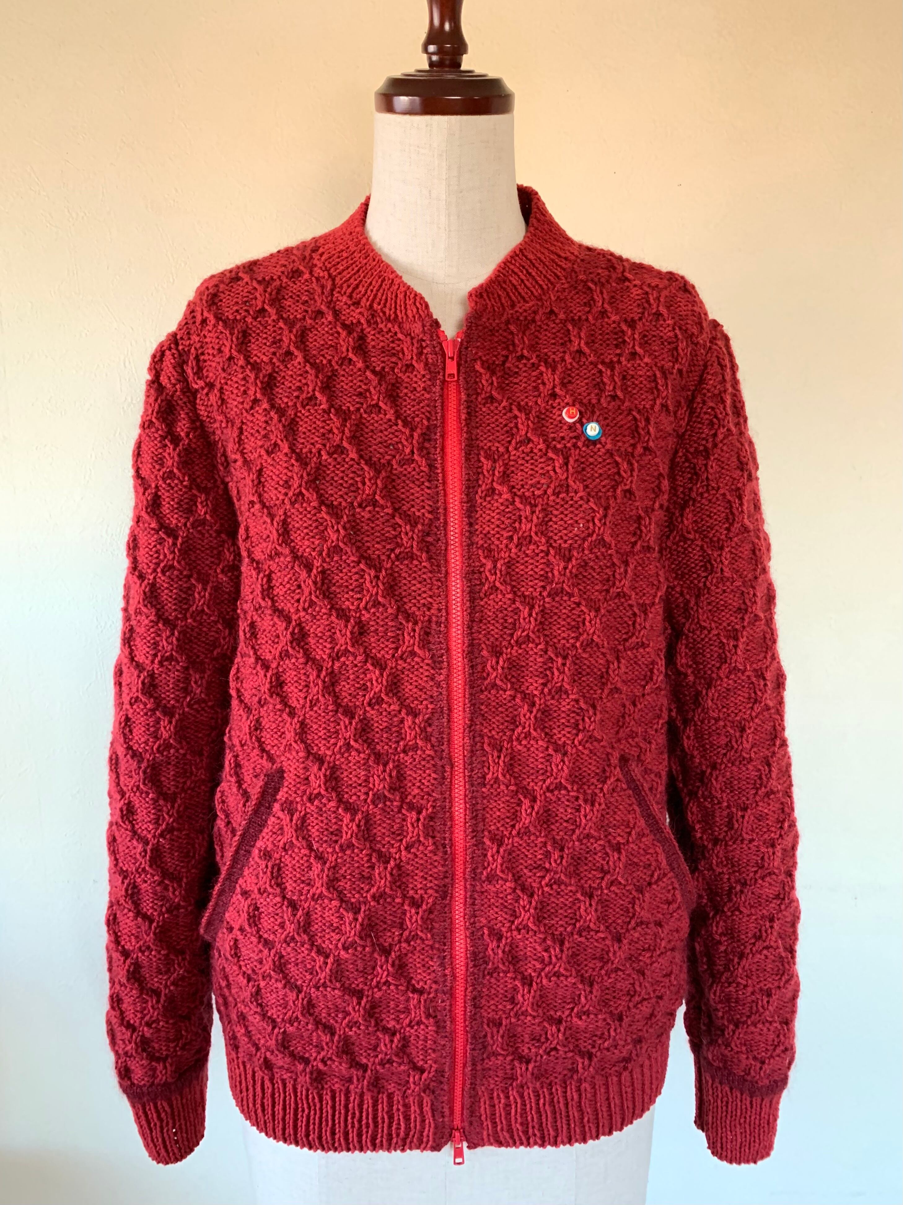 ウールの毛糸に極細のシルクモヘアを引き揃え、2本取りで編んだスタジャン(スタジアムジャンパー)、またの名をバーシティジャケット。