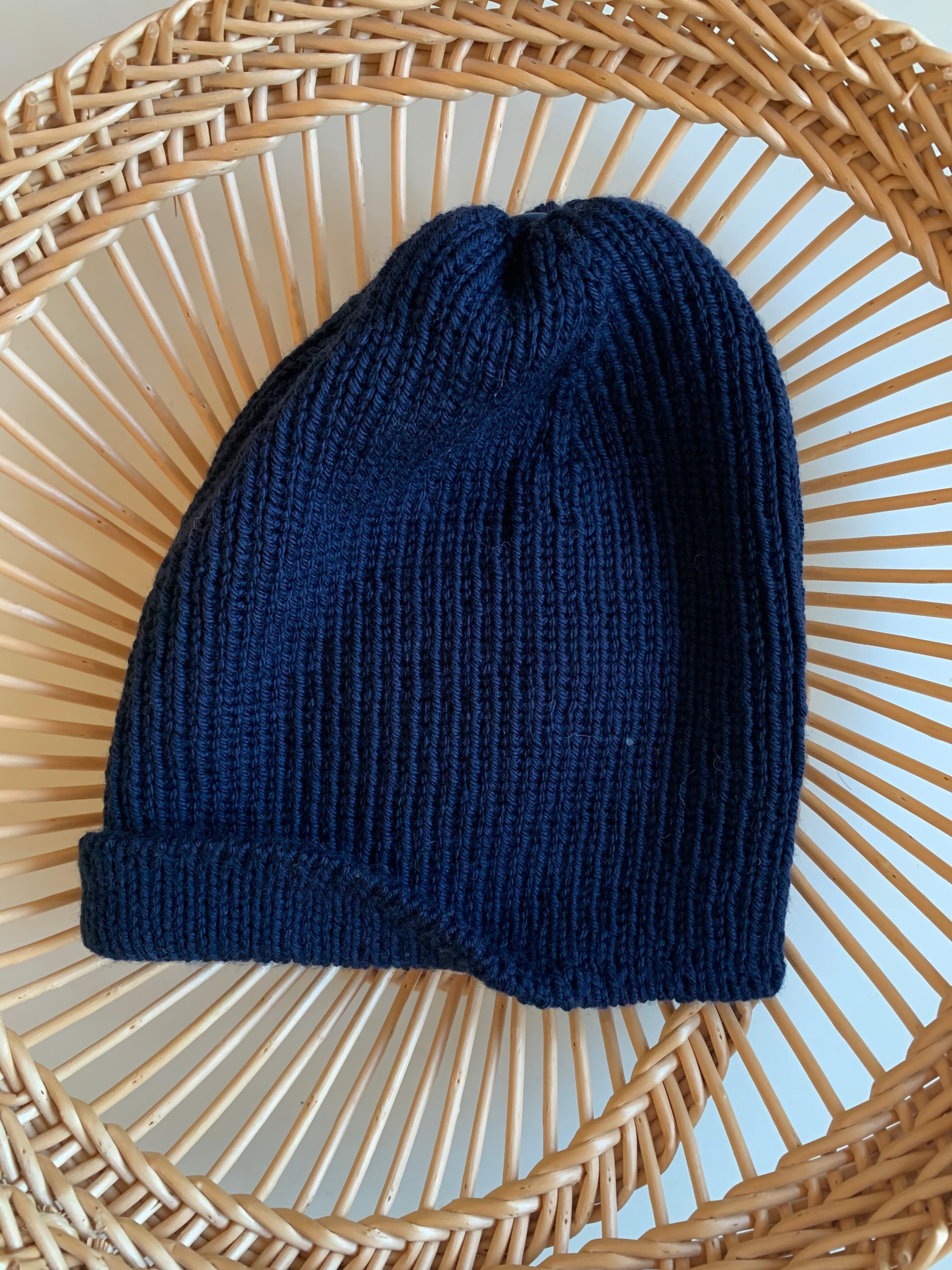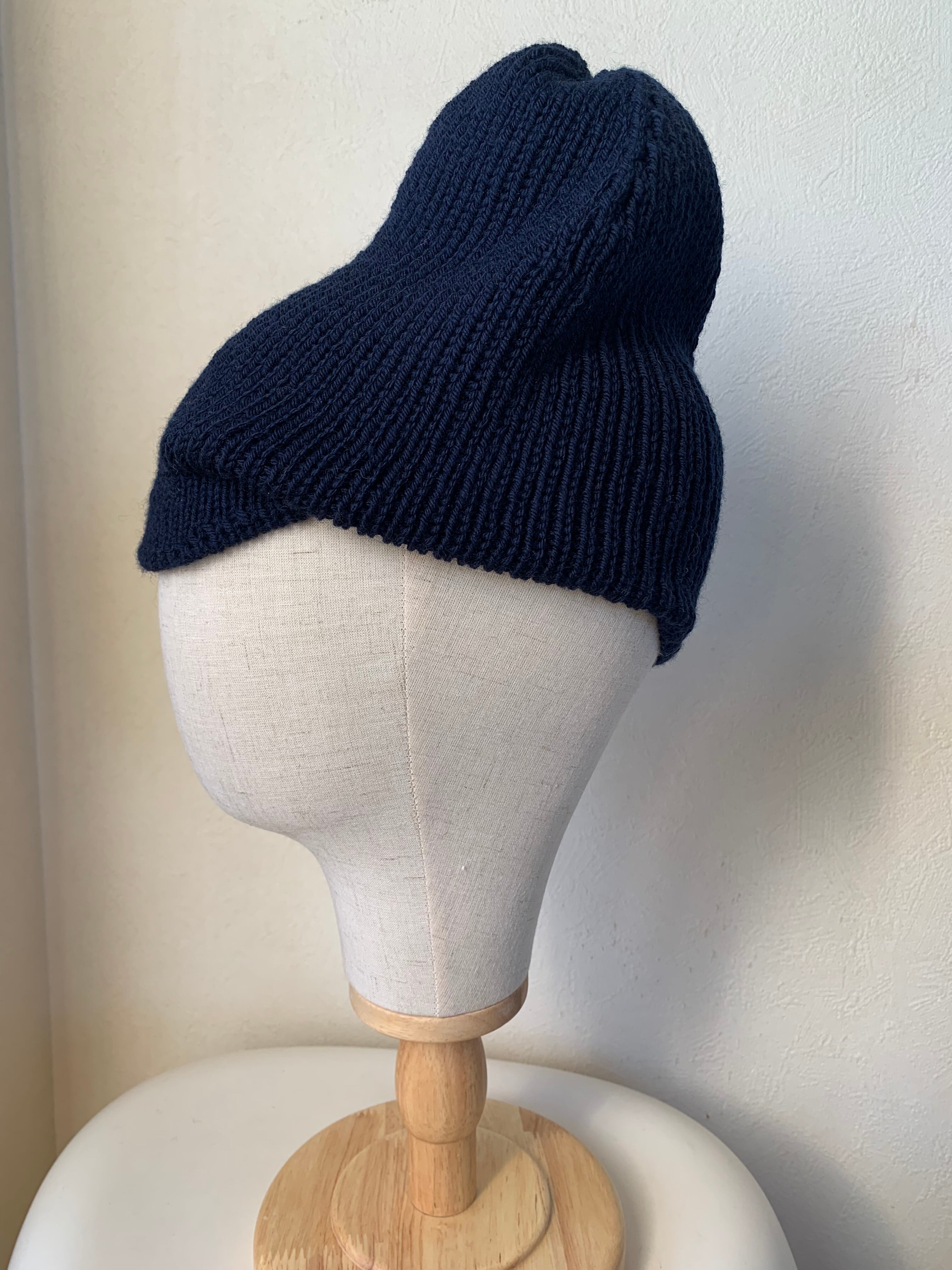 こちらはシンプルな一色で編み、ツバの長さを短くしたことでより一体化し、見ようによってはイカ人間のようにも見えます。21世紀のイカ人間ニットキャップ、とお呼びください。