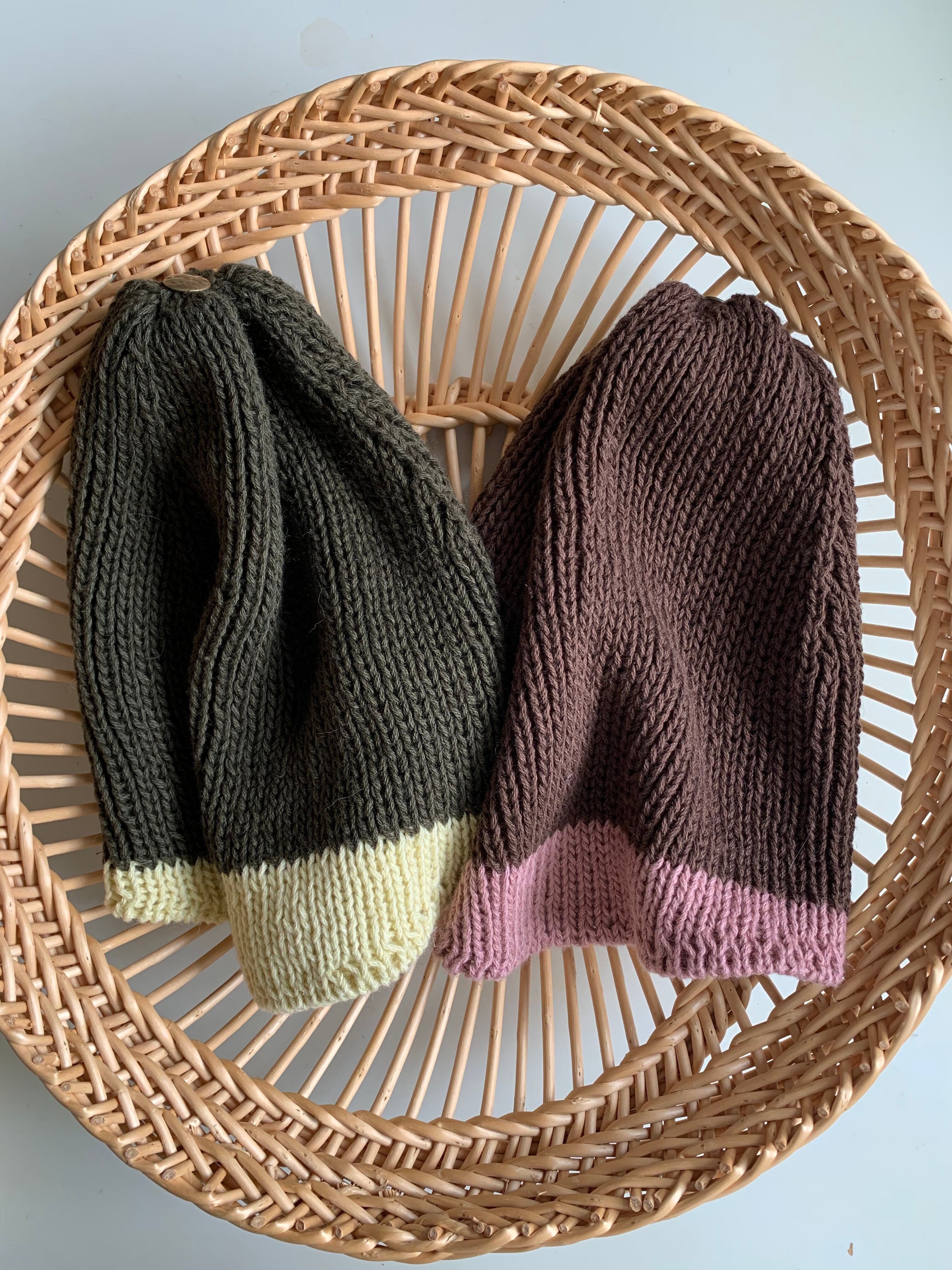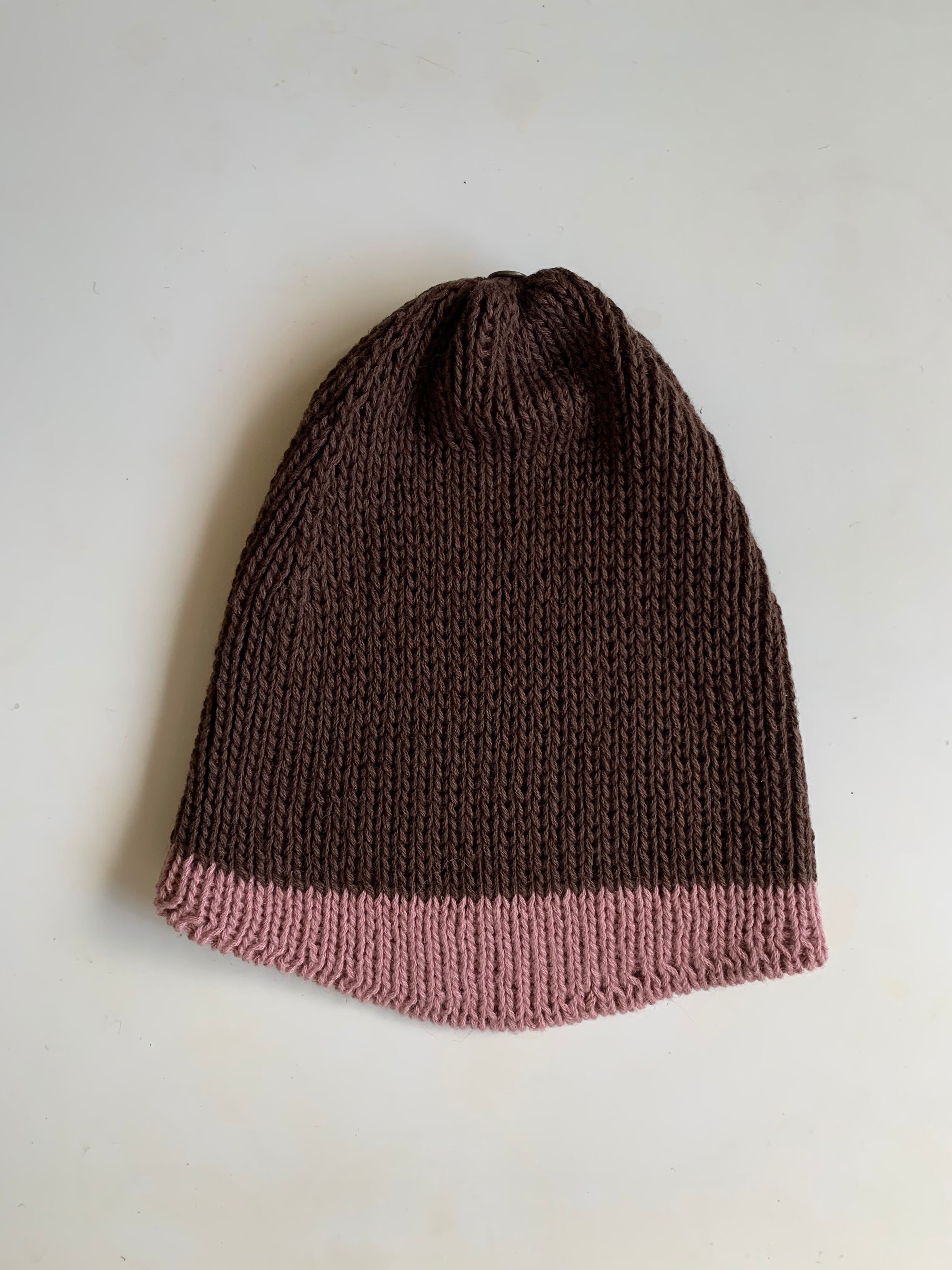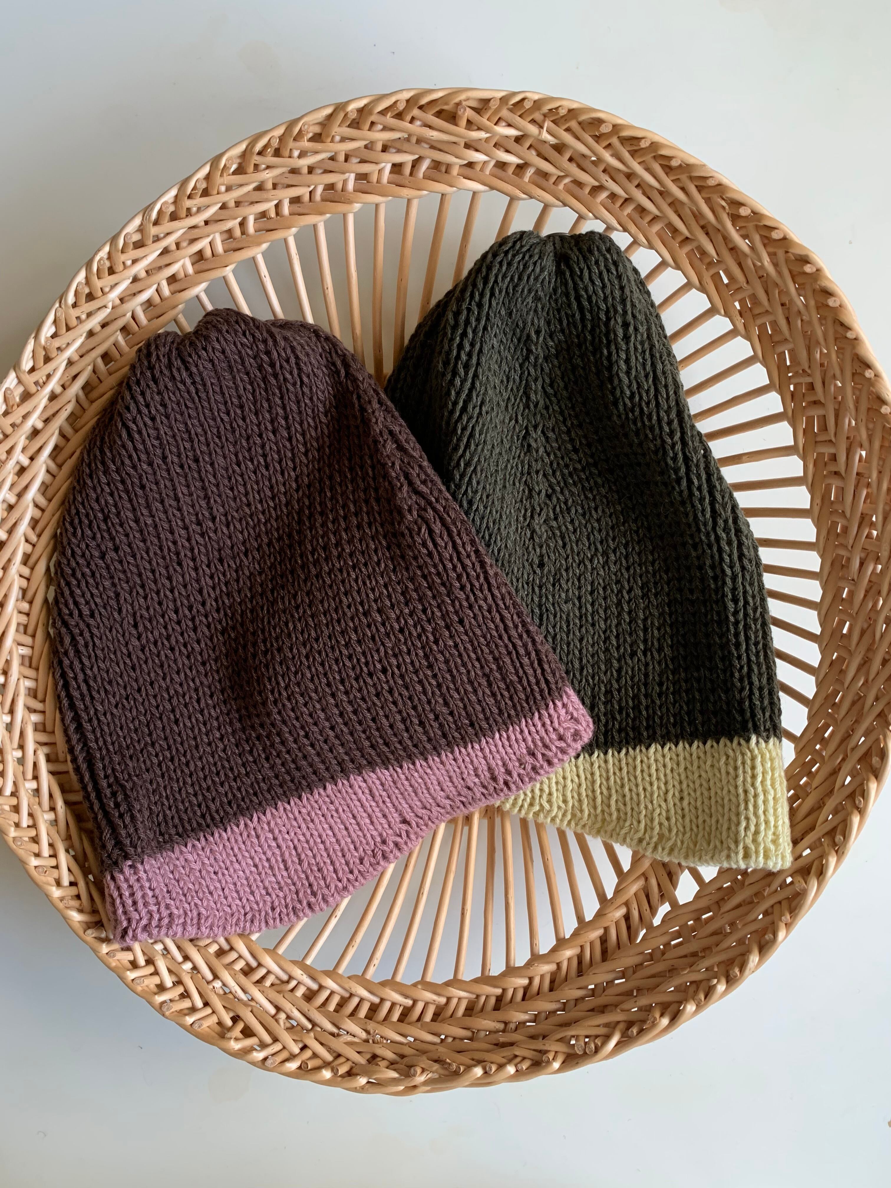 ツバ(ブリム)とニット帽(ビーニー)を一体化させたニットキャップを、さらりとした手触りのコットンリネンで編みました。
