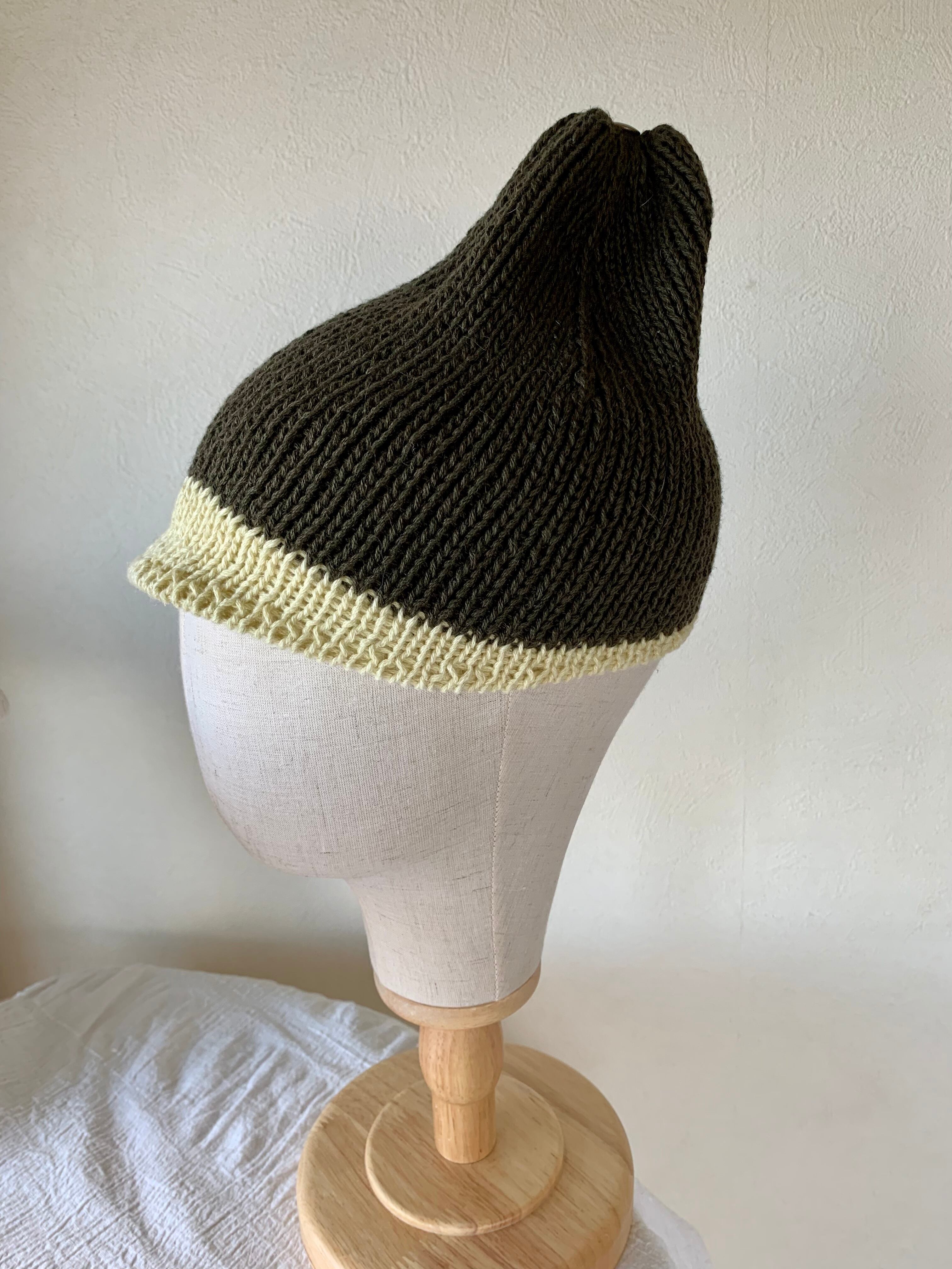 ツバ(ブリム)とニット帽(ビーニー)を一体化させたニットキャップを、さらりとした手触りのコットンリネンで編みました。