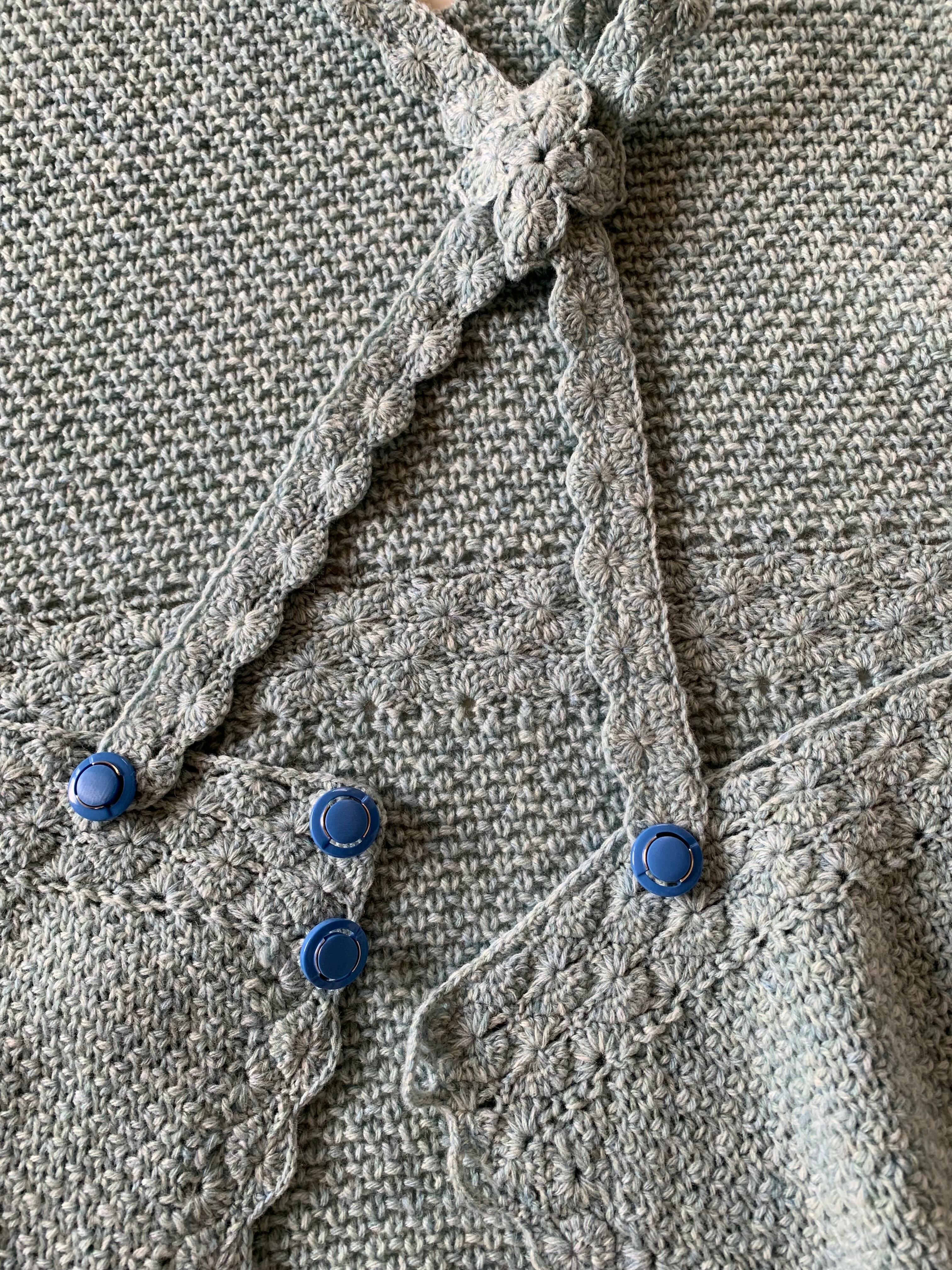 ぽこぽこした引き上げかのこ編みで編んだウォーターブルーのニットのピナフォアです。