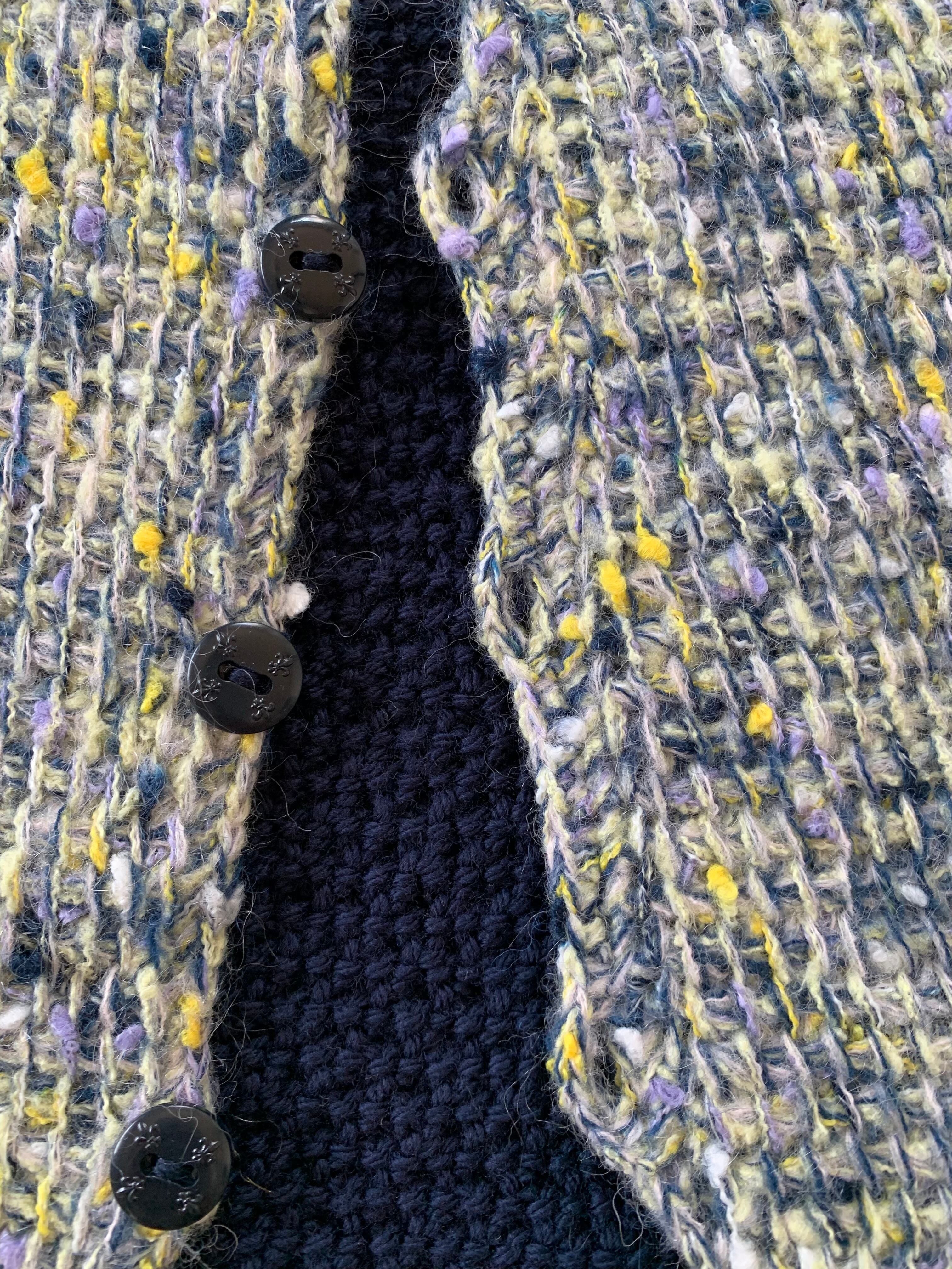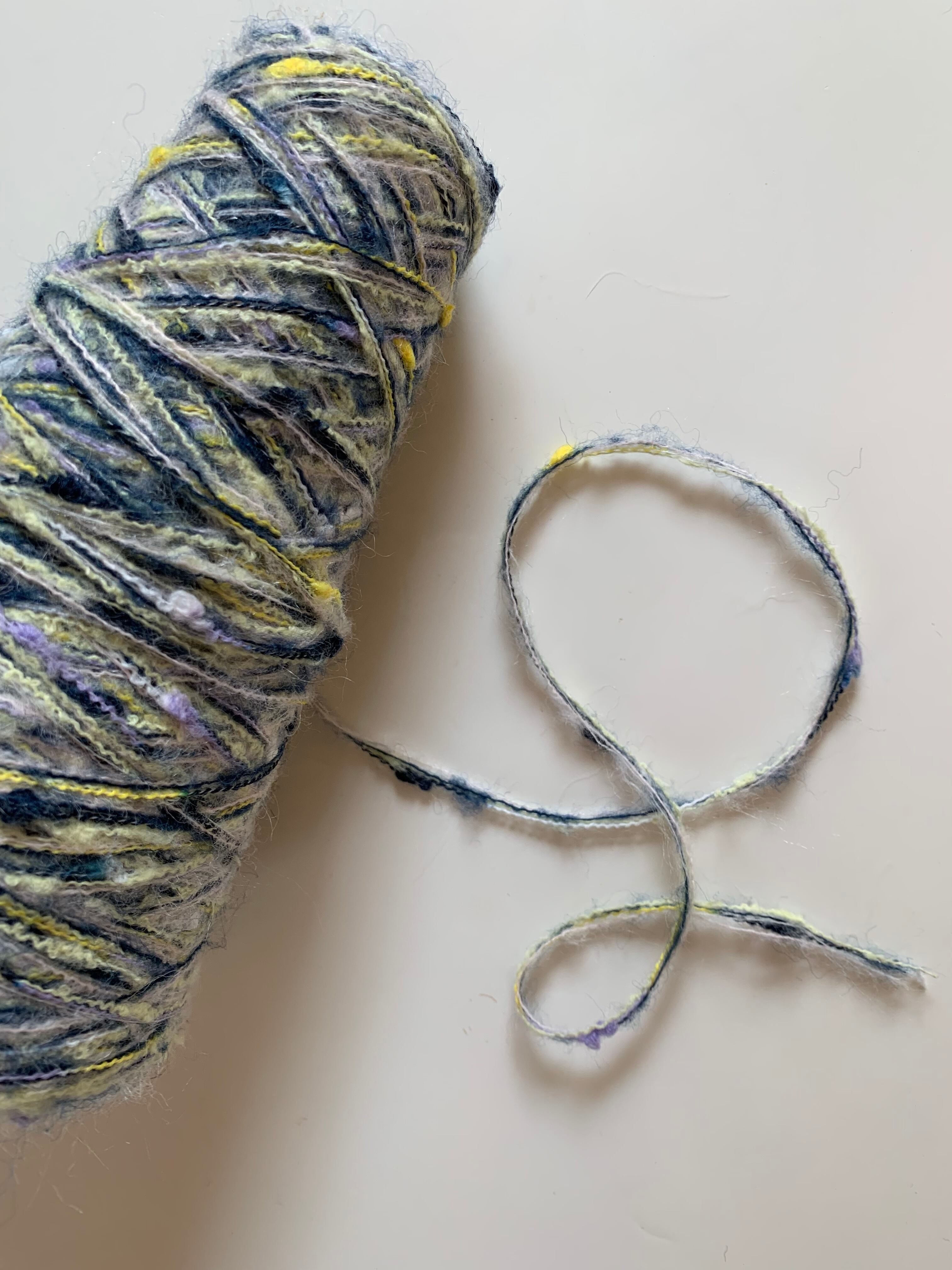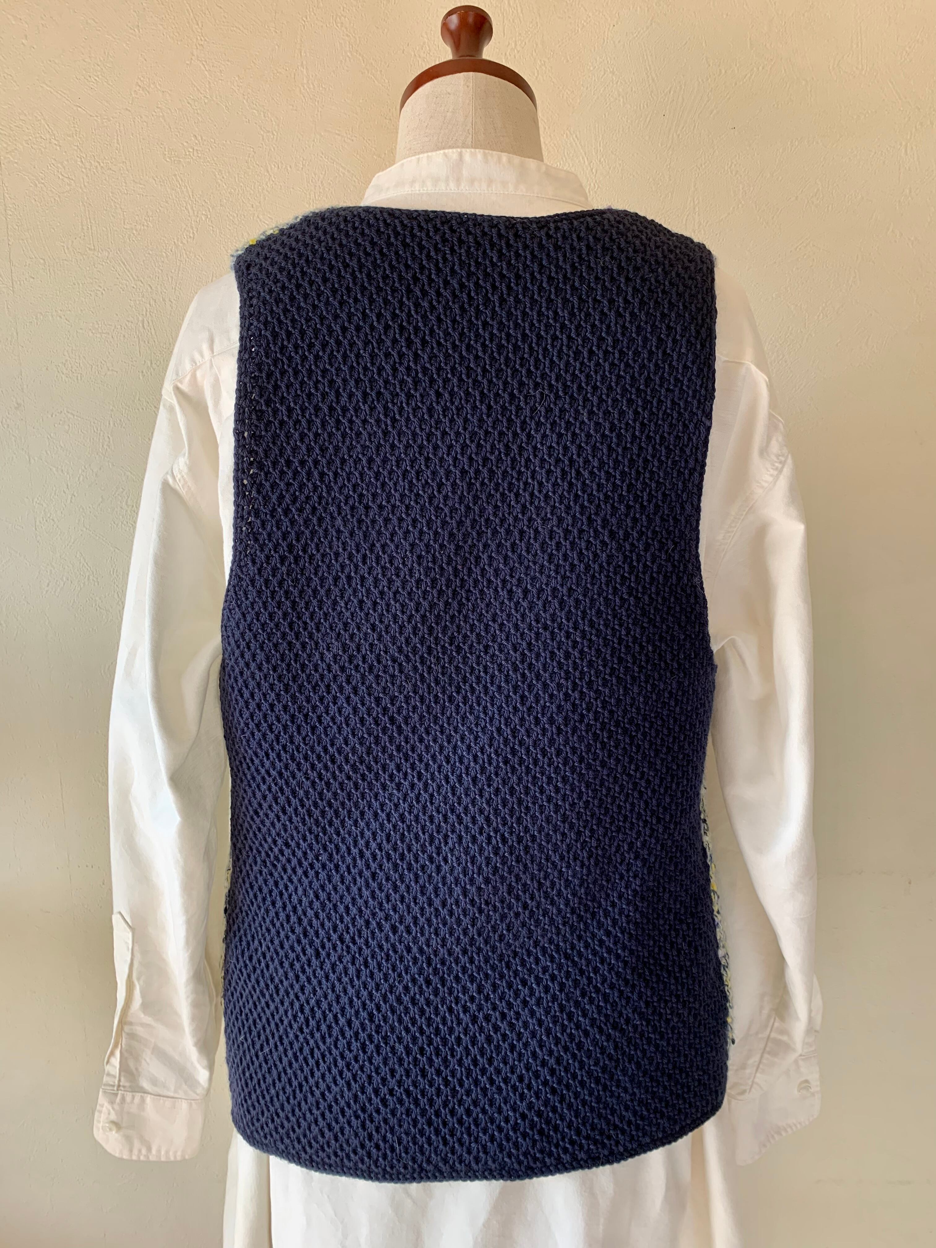 毛糸メーカーの余り糸を何本か引き揃えたアップサイクルヤーン、ニッティングバードさんの一期一会糸。無駄なく糸を美しく生き返らせるアップサイクルの取り組みに便乗したのが、この画家のベストです。
