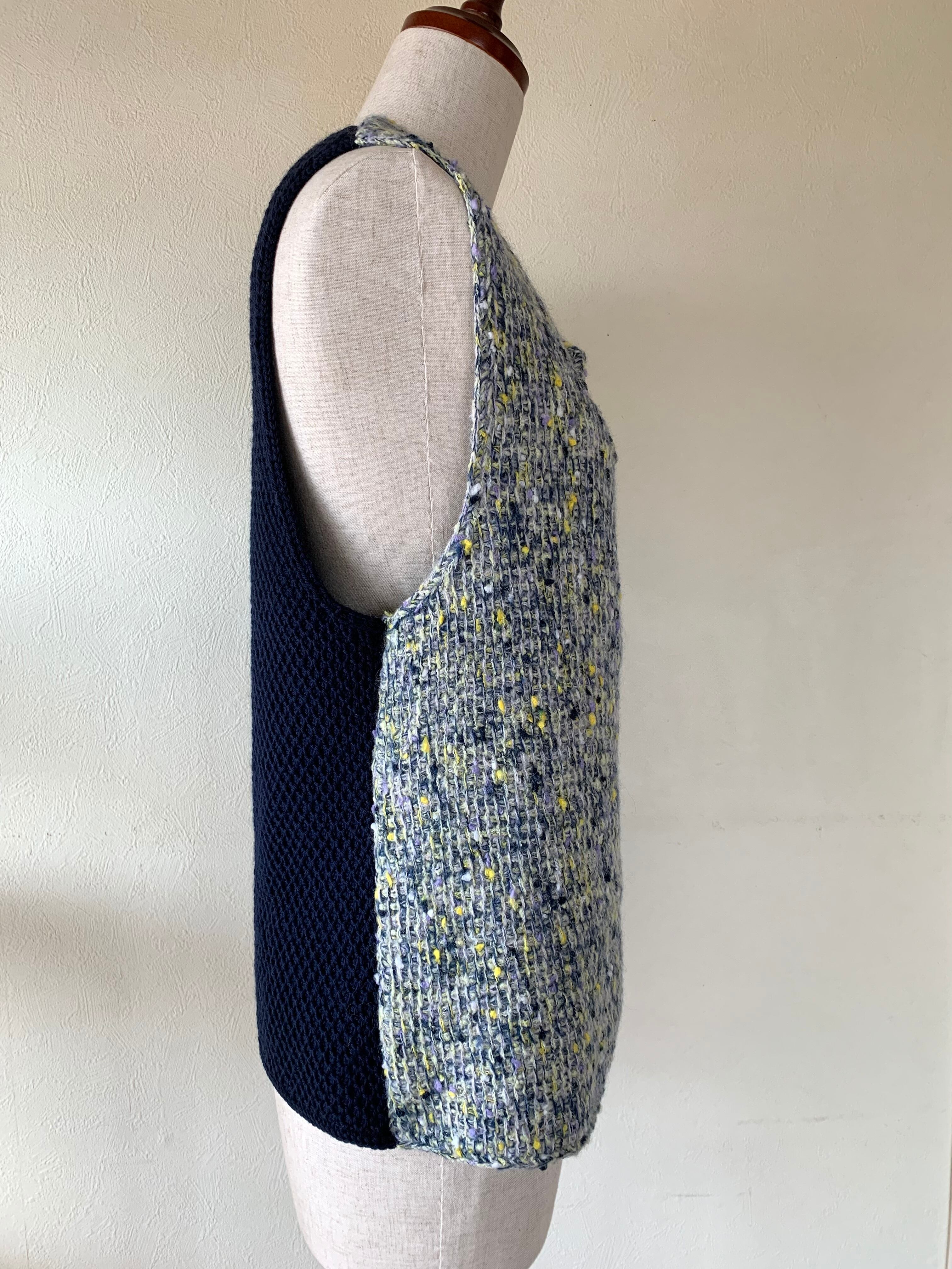 前身頃と後身頃の色を変える、編み地の面積が小さいベストだからこそ出来ました。
