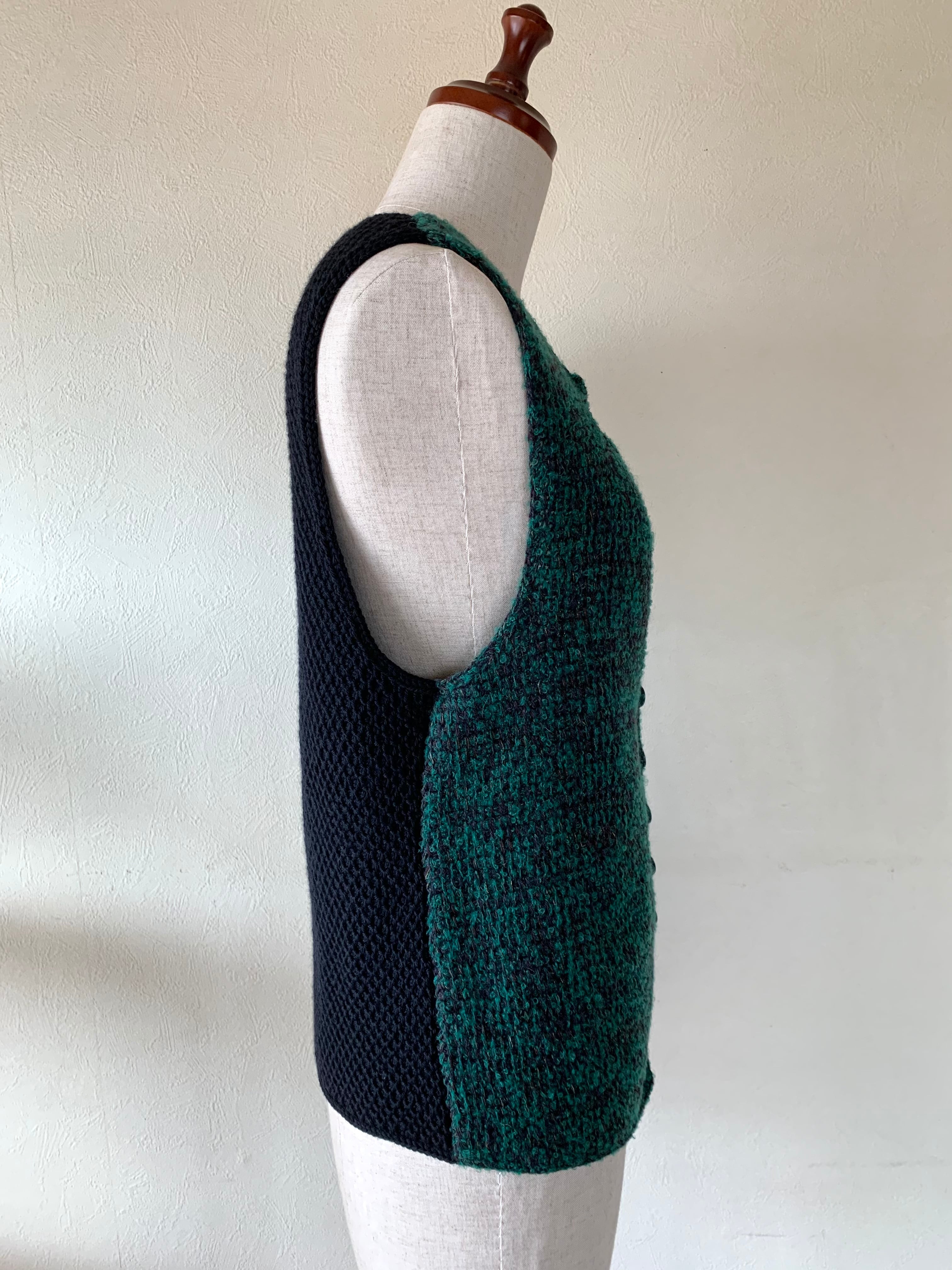 前身頃と後身頃の色を変える、編み地の面積が小さいベストだからこそ出来ました。