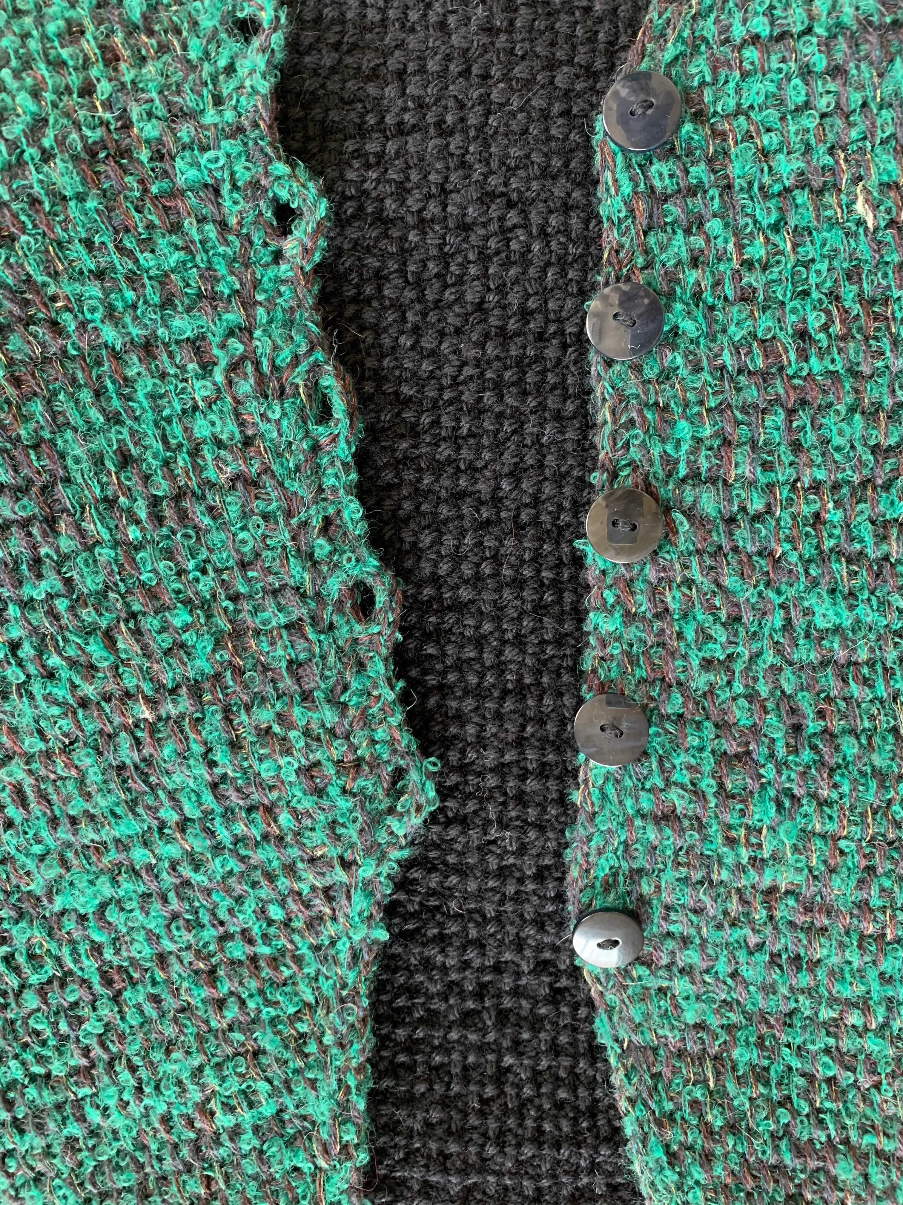 毛糸メーカーの余り糸を何本か引き揃えたアップサイクルヤーン、ニッティングバードさんの一期一会糸。無駄なく糸を美しく生き返らせるアップサイクルの取り組みに便乗したのが、この画家のベストです。
