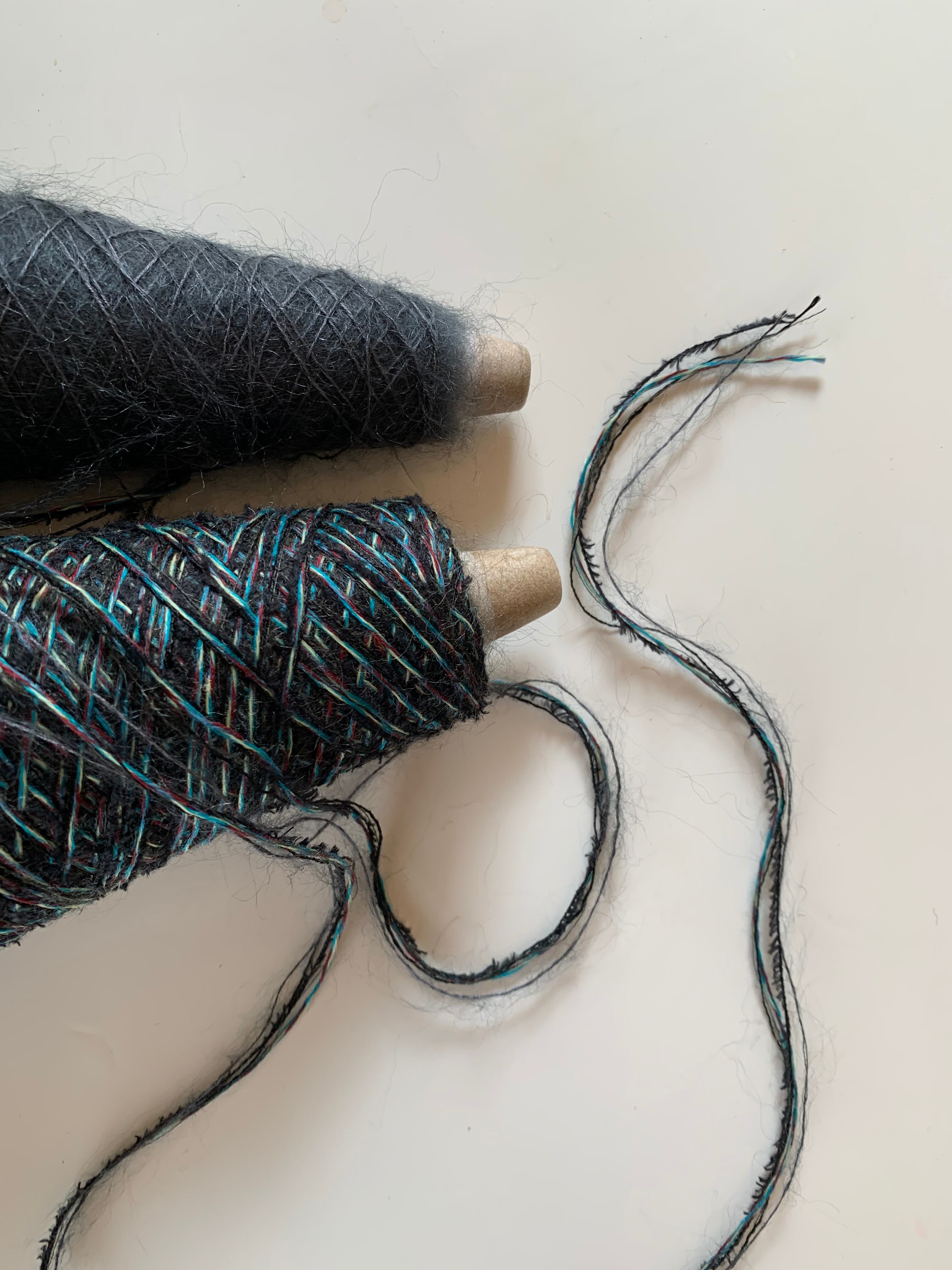 毛糸メーカーの余り糸を何本か引き揃えたアップサイクルヤーン、ニッティングバードさんの一期一会糸。無駄なく糸を美しく生き返らせるアップサイクルの取り組みに便乗したのが、この画家のベストです。