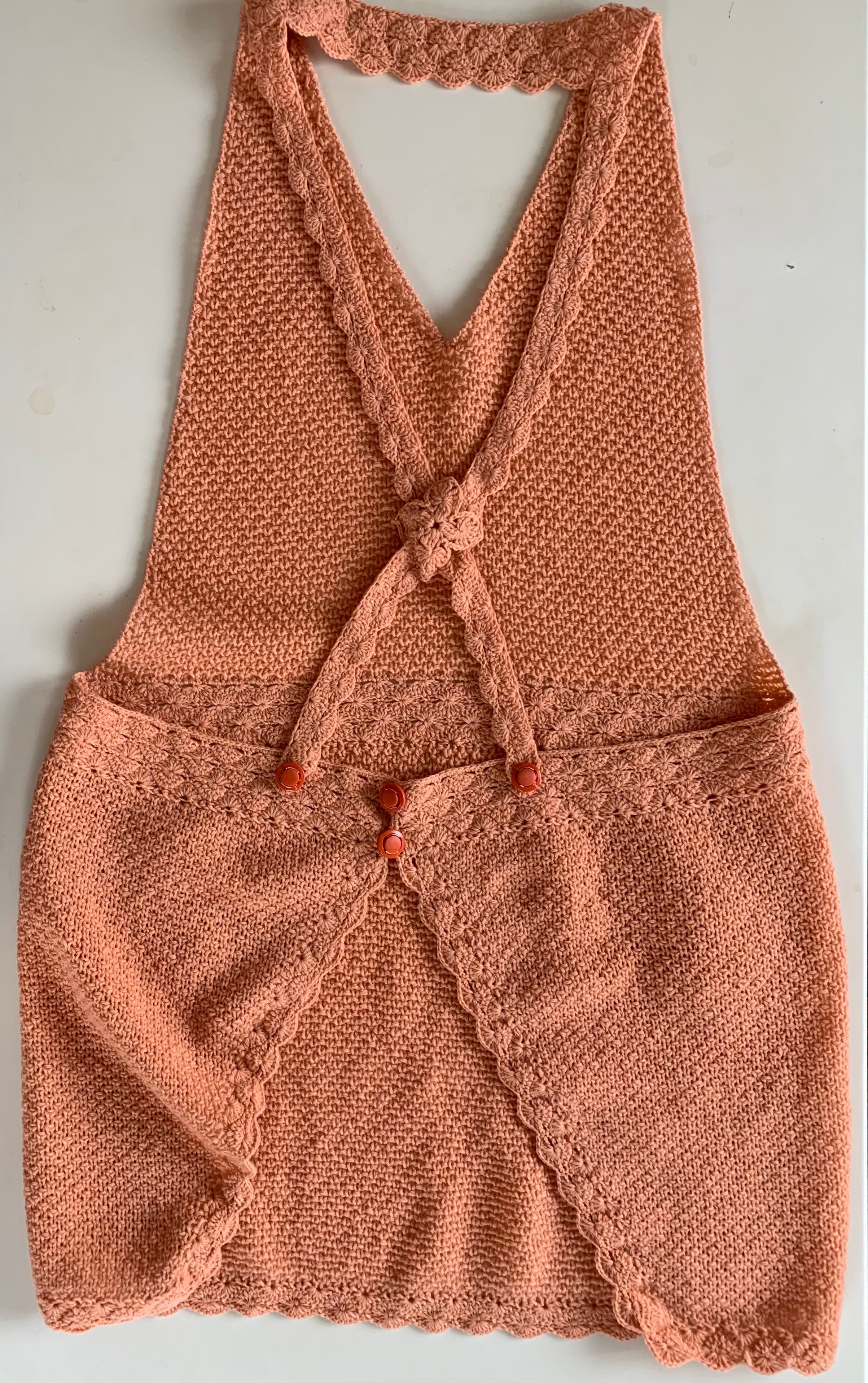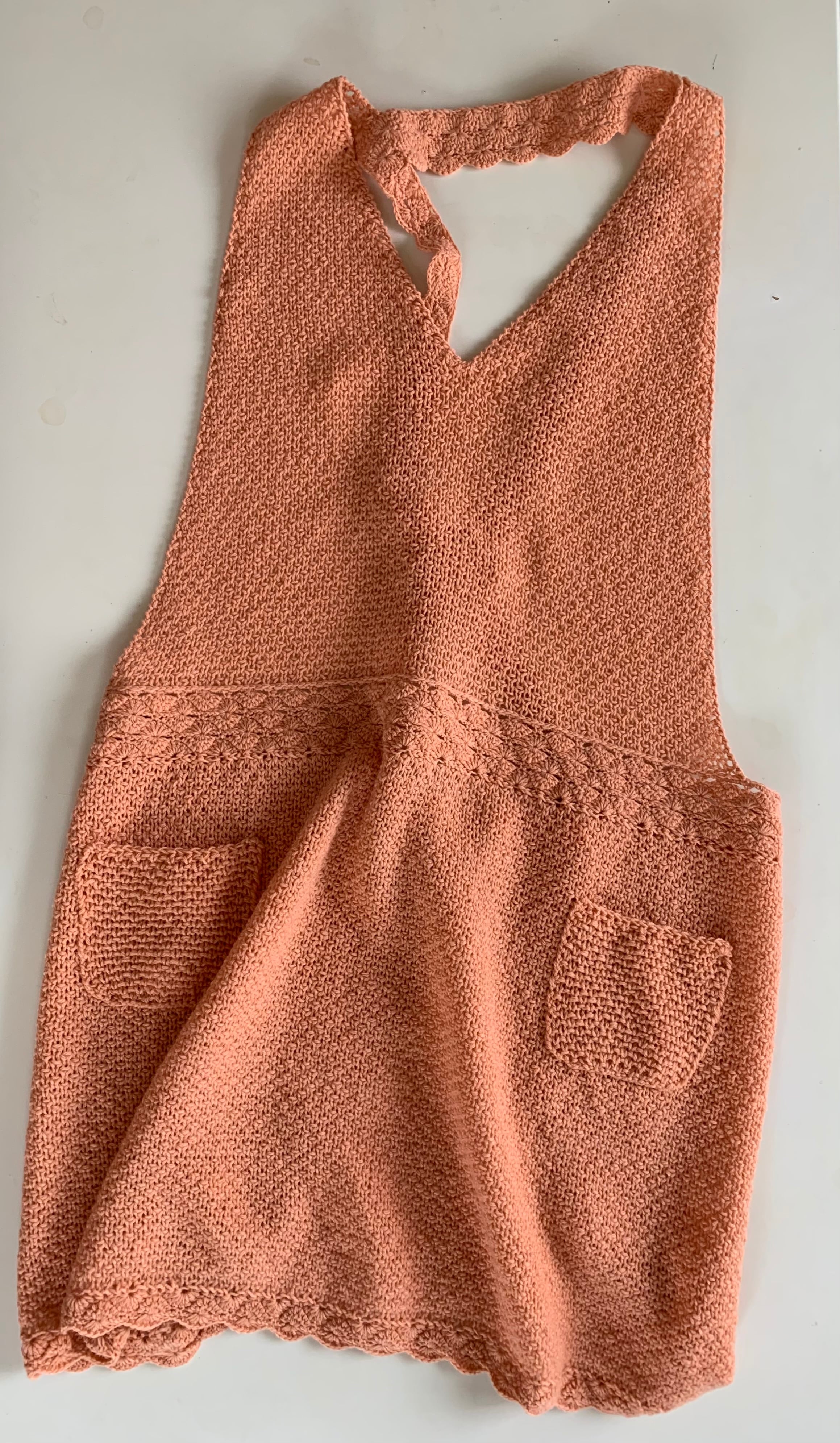 ぽこぽこした引き上げかのこ編みで編んだアプリコットオレンジのニットのピナフォアです。