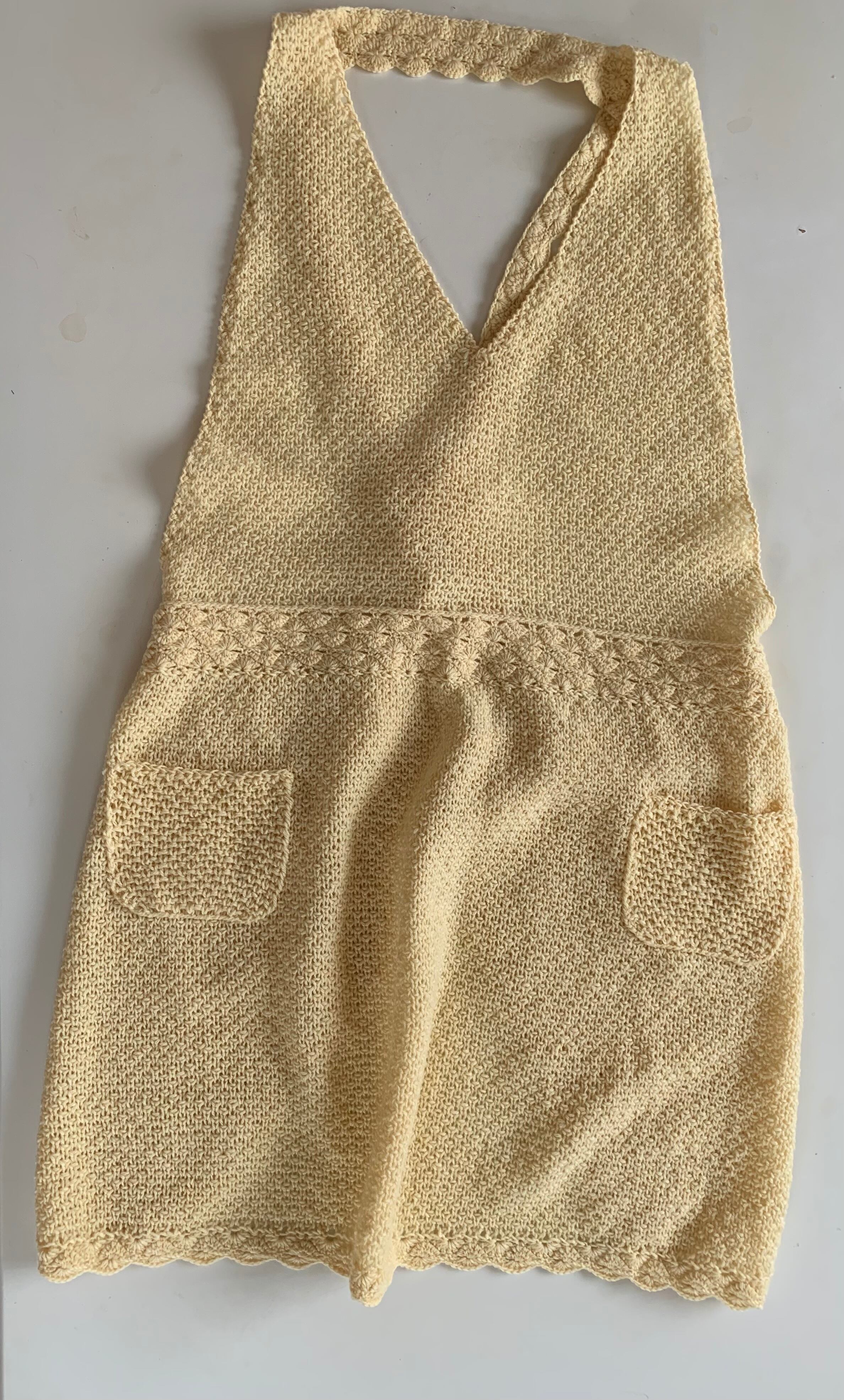 ぽこぽこした引き上げかのこ編みで編んだレモンイエローのニットのピナフォアです。