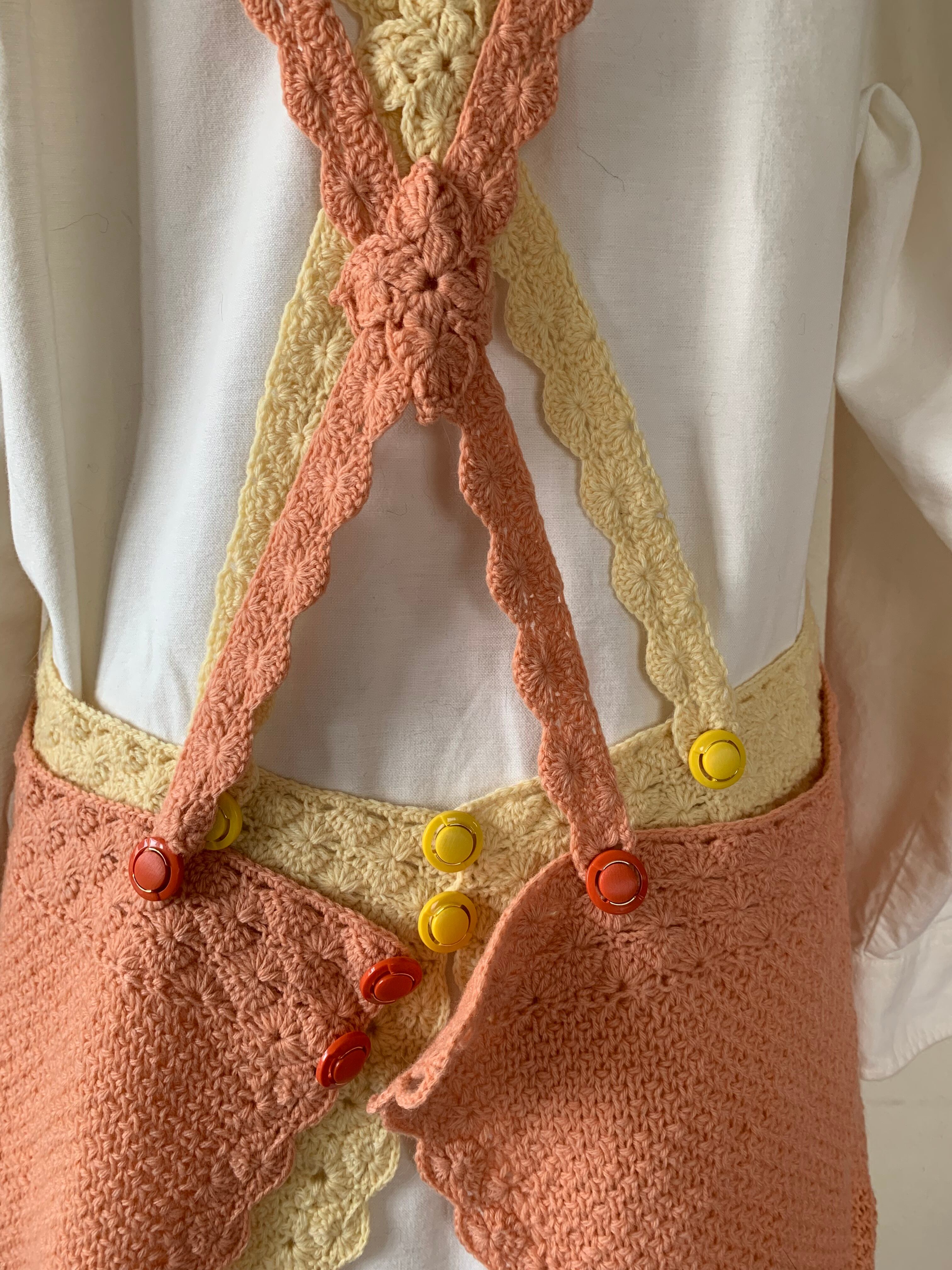 丈と腰まわりをゆったりと、ウエストと裾周り、背中のサスペンダーはかぎ針編みで軽やかに。引き上げかのこの編み地は裏も可愛いので、ポケットはこの裏側を見せる為に付けました。