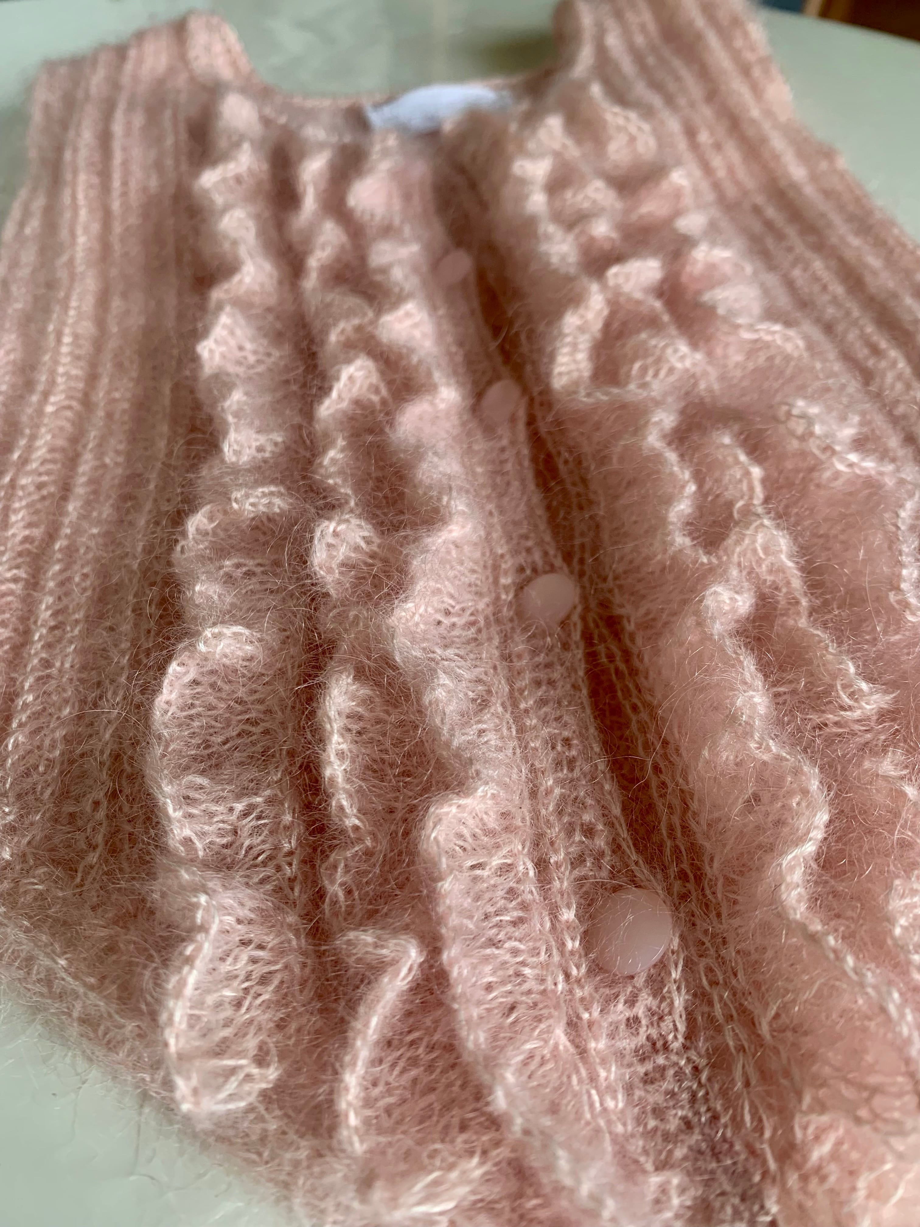 繊細なシルクモヘアの糸で編んだフリルピンタックのヨーク付け襟です。こちらはベビーピンクです。