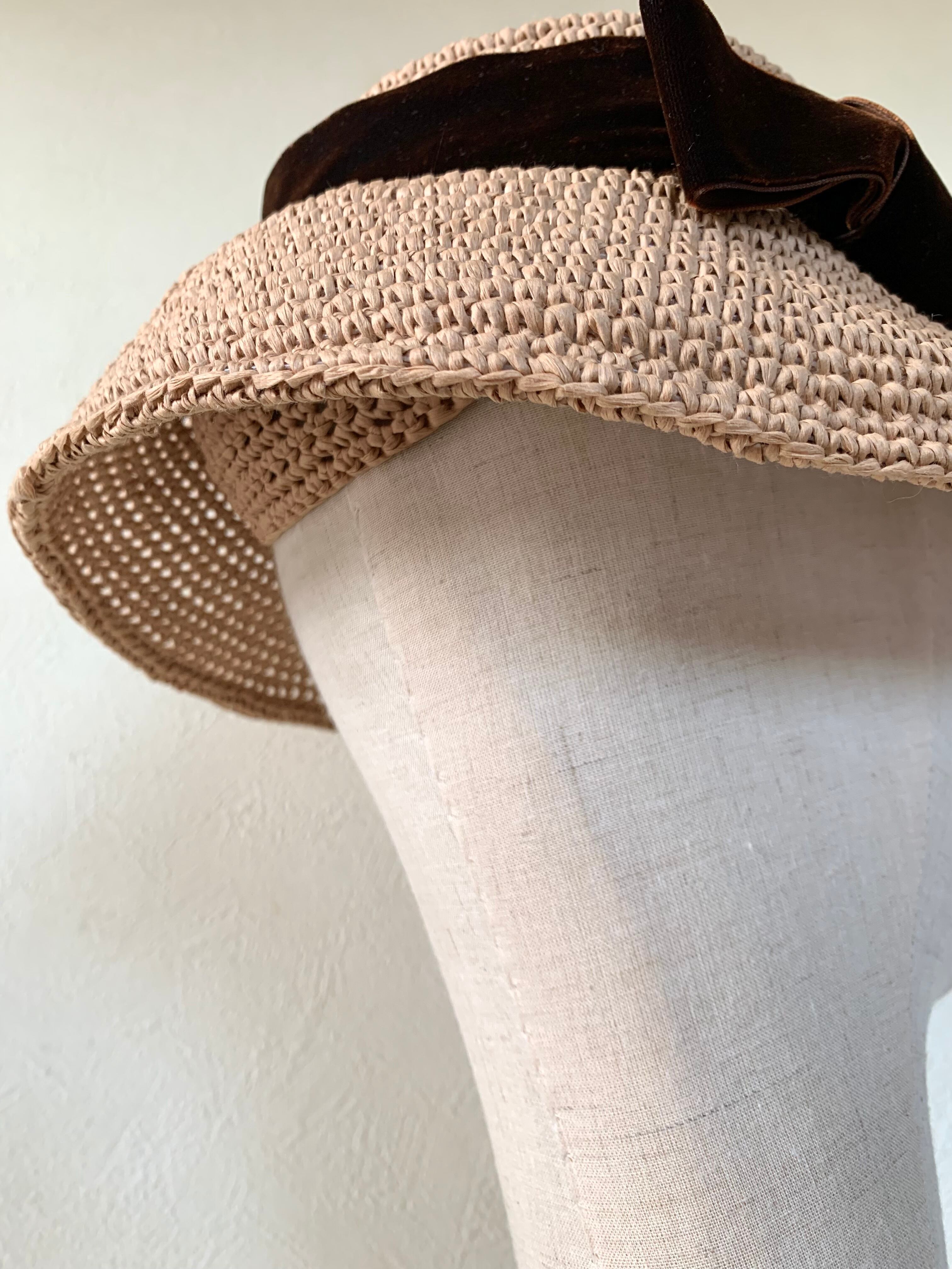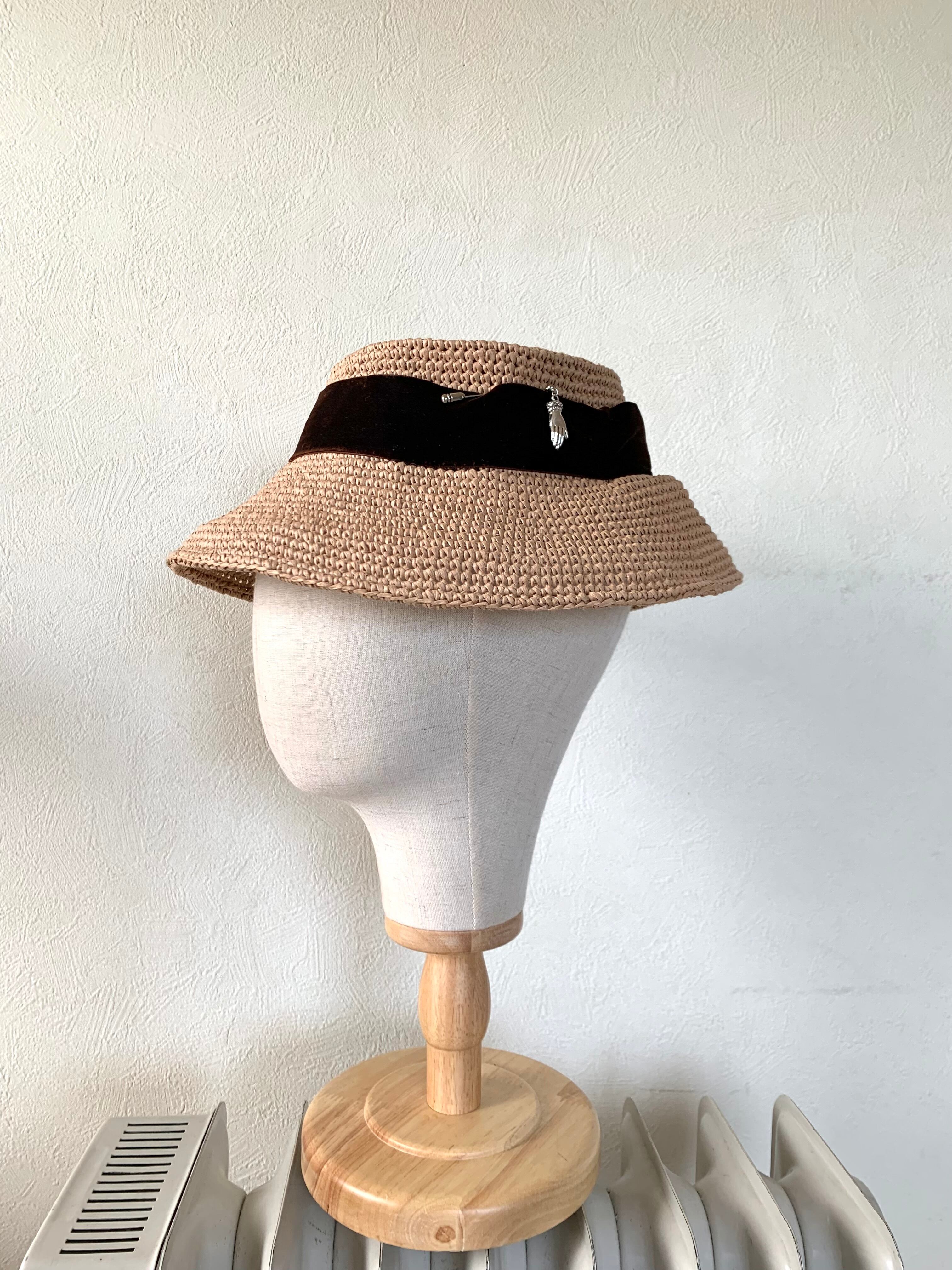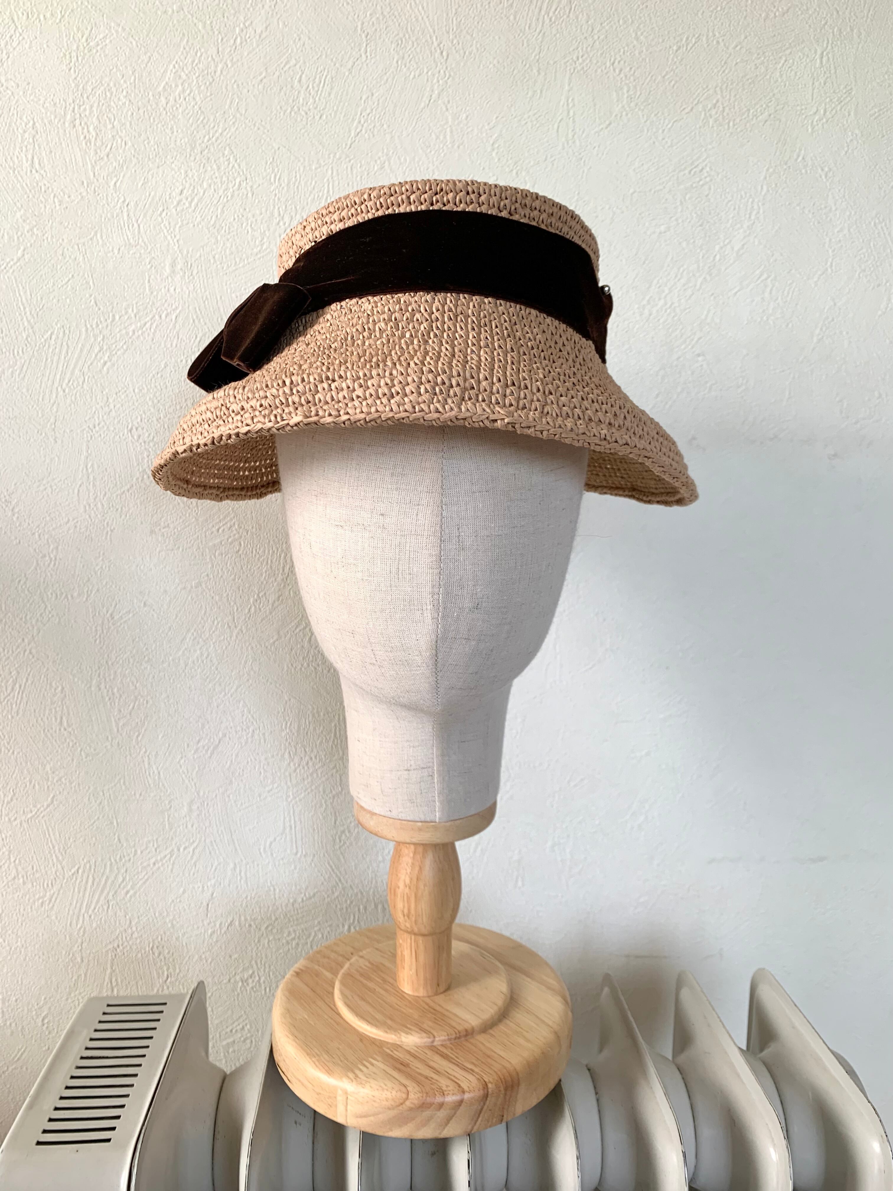 低いクラウンとなだらかに広がるブリムのシルエット。本来は結った髪にハットピンをぐさっと刺して固定してかぶる形の帽子ですが、ショートヘアの方にも安定してかぶっていただくために、